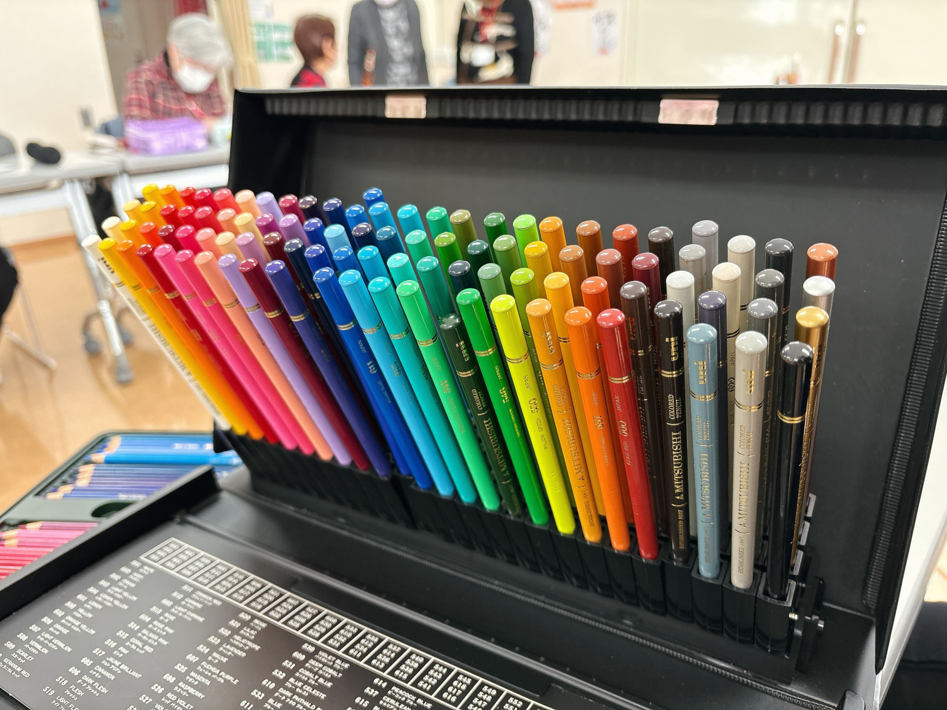 そんな中、ひときわ話題をさらったのが井上講師の“秘密兵器”。なんと100色セットの色鉛筆を持ってきてくださり、箱を開けた瞬間、みんなで思わず「わぁ〜!」と歓声が上がりました。