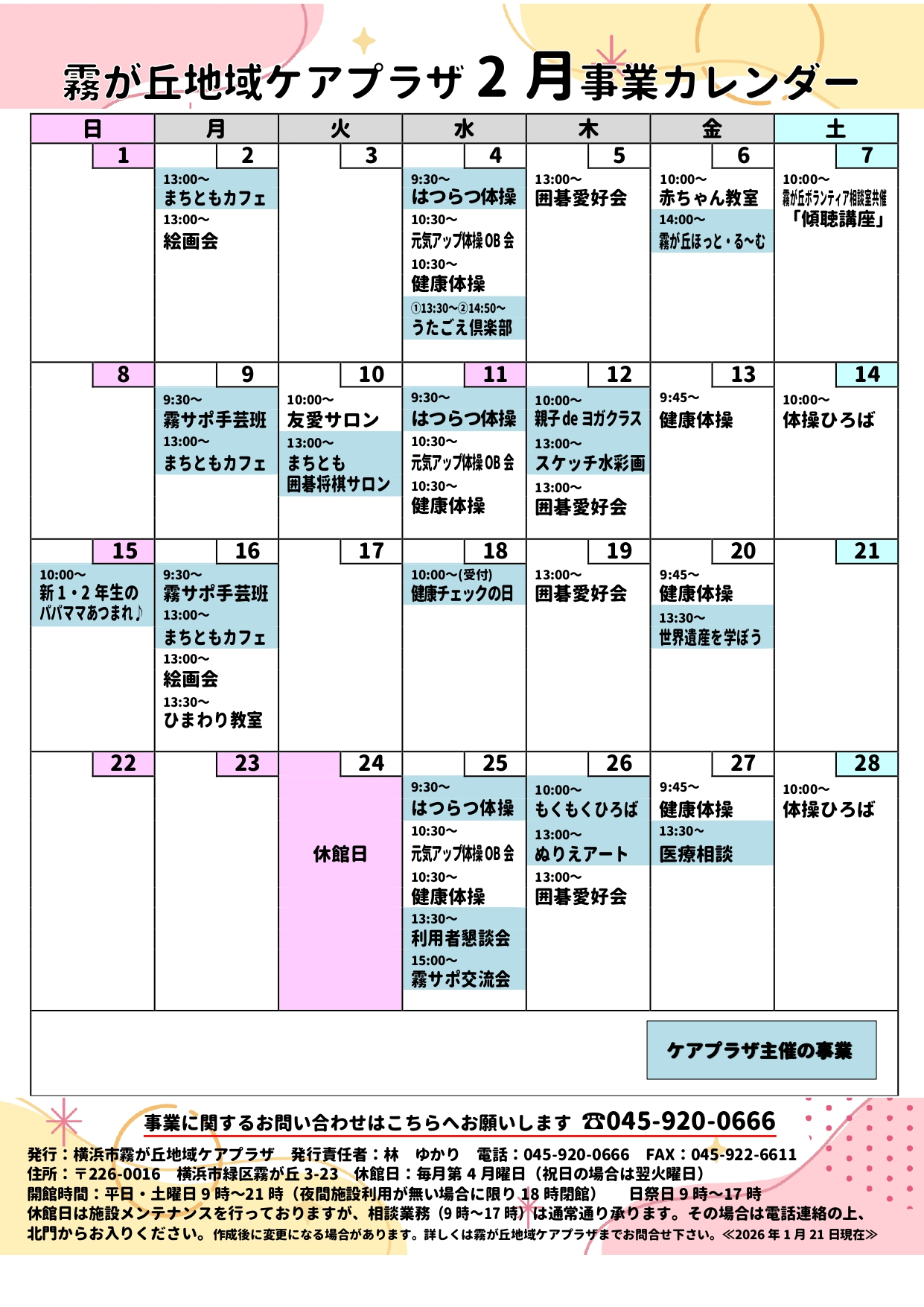 【横浜市霧が丘地域ケアプラザ】2月事業カレンダーができました!