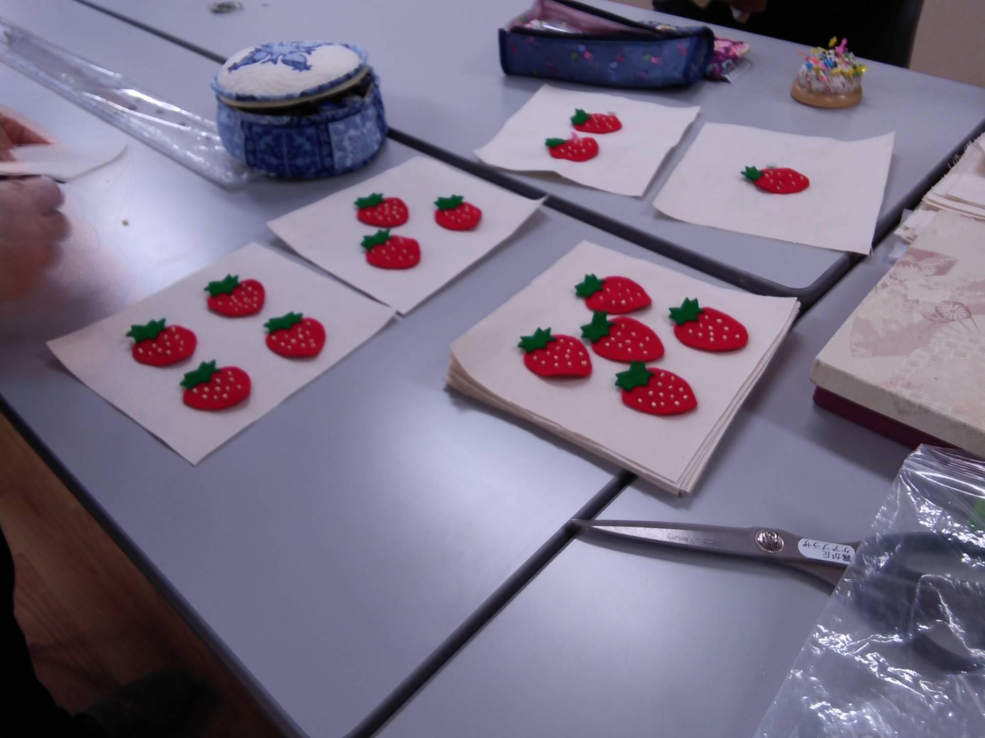 部屋に入った瞬間、まず目に飛び込んできたのは、机いっぱいに並んだ“ちいさな苺”たち。思わず笑顔になってしまうほど可愛らしく、そして驚くほど精巧なつくりで、ひとつひとつにメンバーさんの丁寧な手仕事が感じられました。