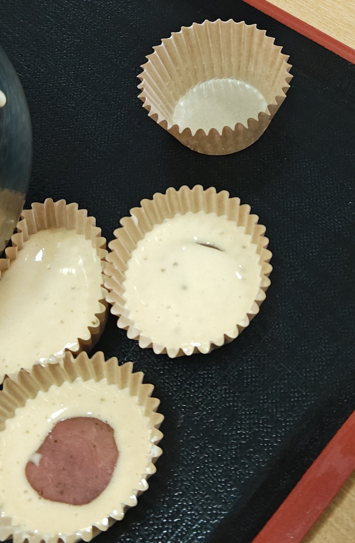 いつもの蒸しパンの生地に桜あんを混ぜ、中にも入れました♪
