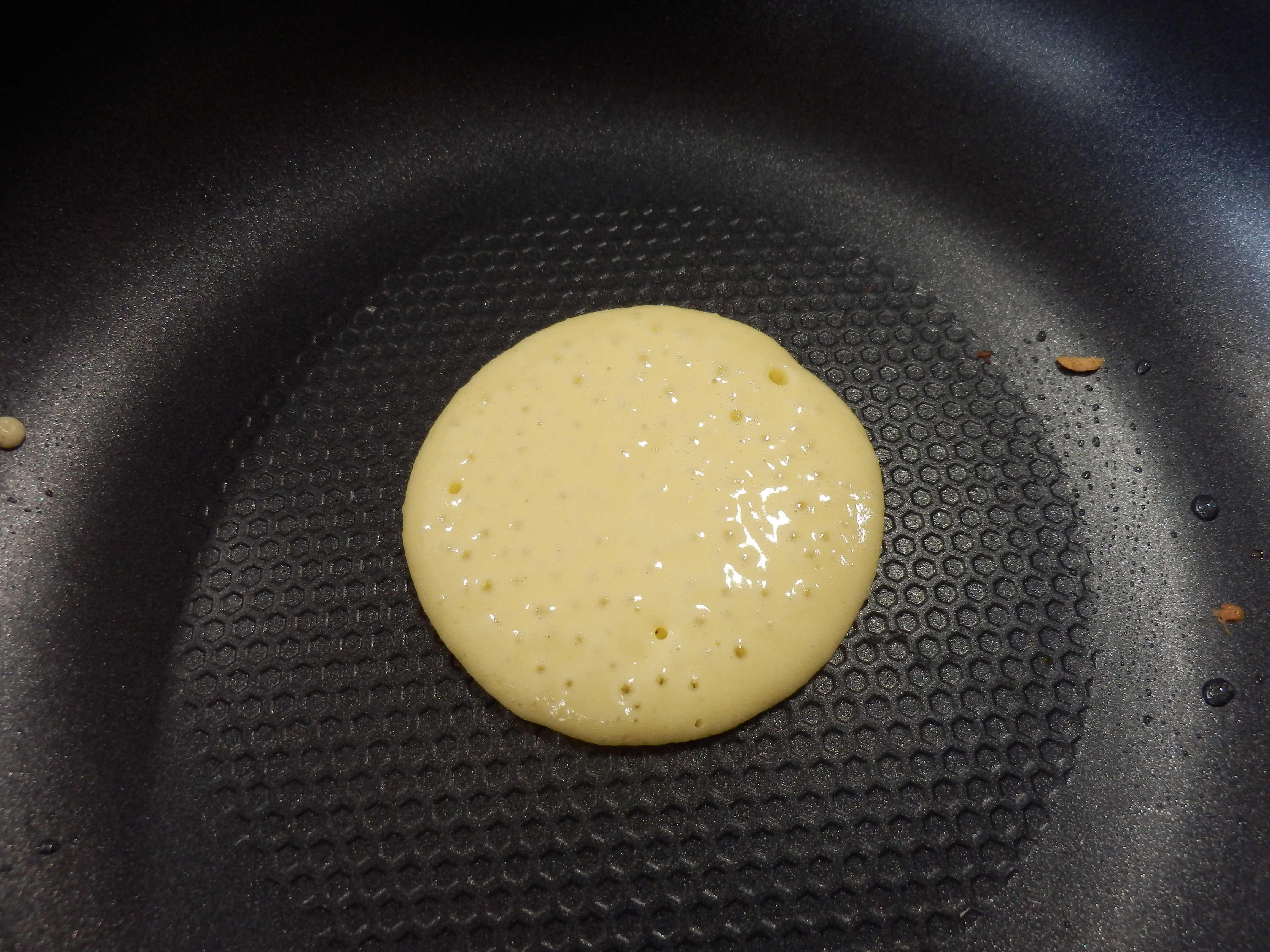 生地を焼きます!最初2~3枚一緒に焼こうと思い端から生地を流したら丸くならず…。
