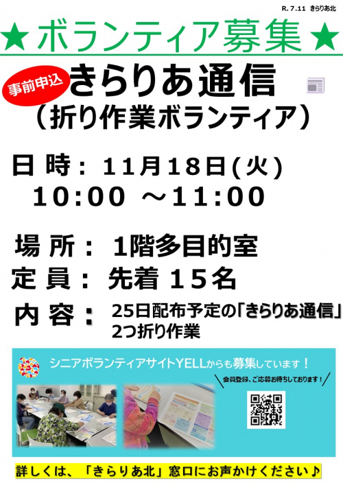 2025.11.21 【活動報告】Zoom講座開催いたしました 活動報告 2025.11.16 【もう一度パソコン再入門講座】第2回開催されました‼ ニュース 2025.11.16 11月【きらりあ花と緑のくらぶ】活動報告です‼ 活動報告 2025.11.14 【活動報告】きらりあマルシェ10月25日(土)開催いたしました!🥬野菜販売① 活動報告 2025.11.14 【活動報告】きらりあマルシェ10月25日(土)開催いたしました!パフォーマンス♪② 活動報告 2025.11.14 【きらりあ通信12月号二つ折り作業ボランティアさん募集】 お知らせ 2025.11.11 【11/18 12/16 Zoom講座】抽選結果 お知らせ 2025.11.11 第13回きらりあスマホ相談会【11/24(月)】抽選結果 お知らせ 2025.11.10 マンション管理員体験・面接会 お知らせ 2025.11.09 【もう一度パソコン再入門講座】第1回スタートしました‼ お知らせ 2025.11.08 【ハロウィンで子どもたちにプレゼントを渡そうイベント】無事終了しました‼ 活動報告 2025.11.08 ピアノコンサート&年末ふるまいのお知らせ&ブログ!! ニュース 2025.10.28 10/27(月)スマホ相談会開催いたしました! 活動報告 2025.10.25 【介護予防のお知らせ11月号】 活動報告(IN) 2025.10.25 【きらりあ通信11月号】 お知らせ 1 2 3 4 5 6 … 32