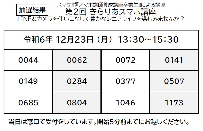 12/23(月)開催「きらりあスマホ講座」の当選結果を発表させていただきます。