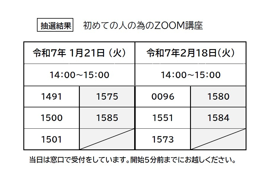 1/21(火)・2/18(火)開催「初めての人のためのZoom講座」の当選結果を発表させていただきます。
