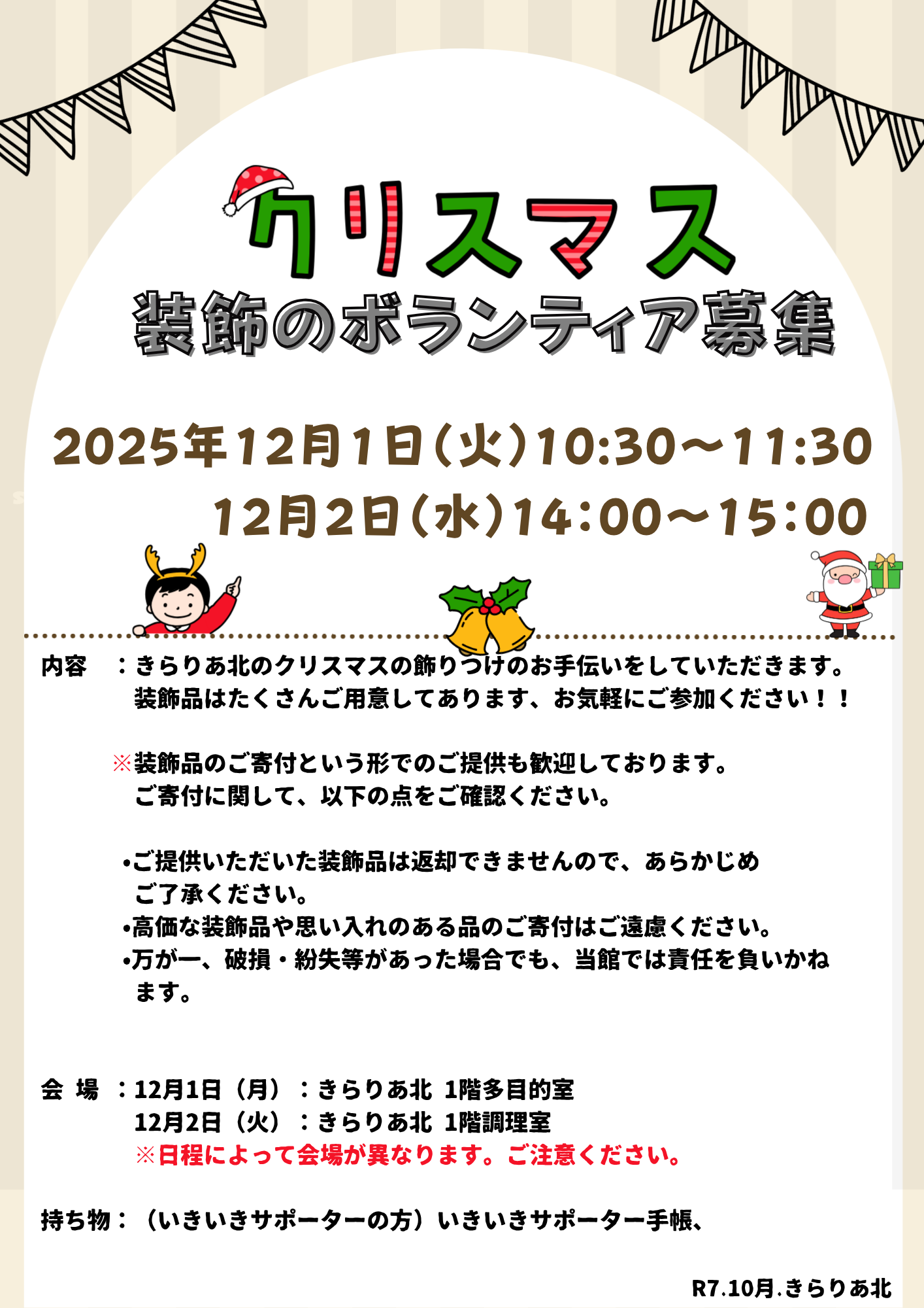 内容 :きらりあ北のクリスマスの飾りつけのお手伝いをしていただきます。