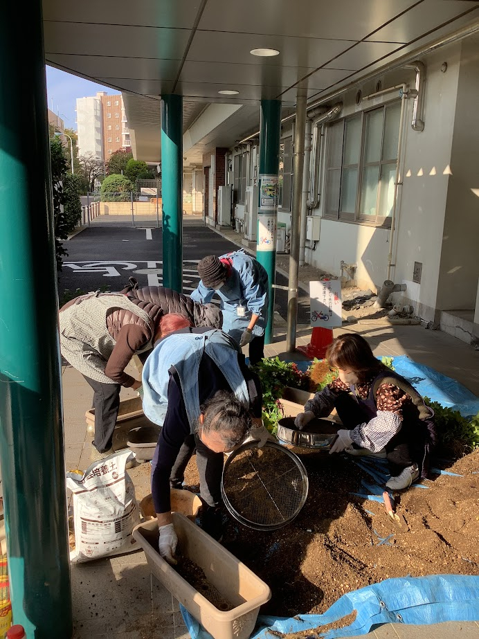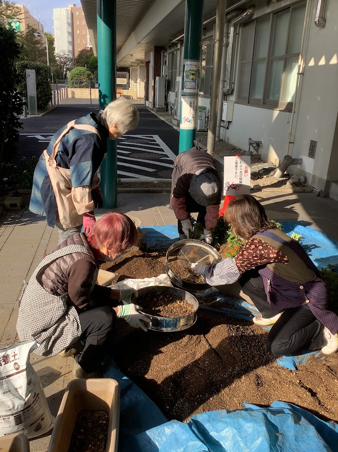 今まで植えられていた花苗をきれいに取り除き、新しい土をふるいにかけ準備してこれからの花苗や球根を植えていきました。