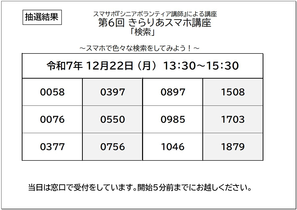 第6回きらりあスマホ講座【12/22(月)】抽選結果