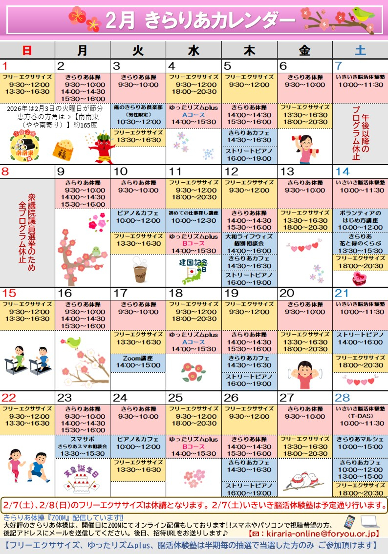 2026.01.25 お知らせ 【介護予防のお知らせ2月号】 Tweet シェアする 【介護予防のお知らせ】 介護予防のお知らせ2月号と年間スケジュール(予定)をご案内します。 前の記事 2026.01.25 お知らせ 3月6日おしごと応援フェア開催します! 次の記事 2026.01.25 お知らせ 【きらりあ通信2月号】 一覧へ戻る