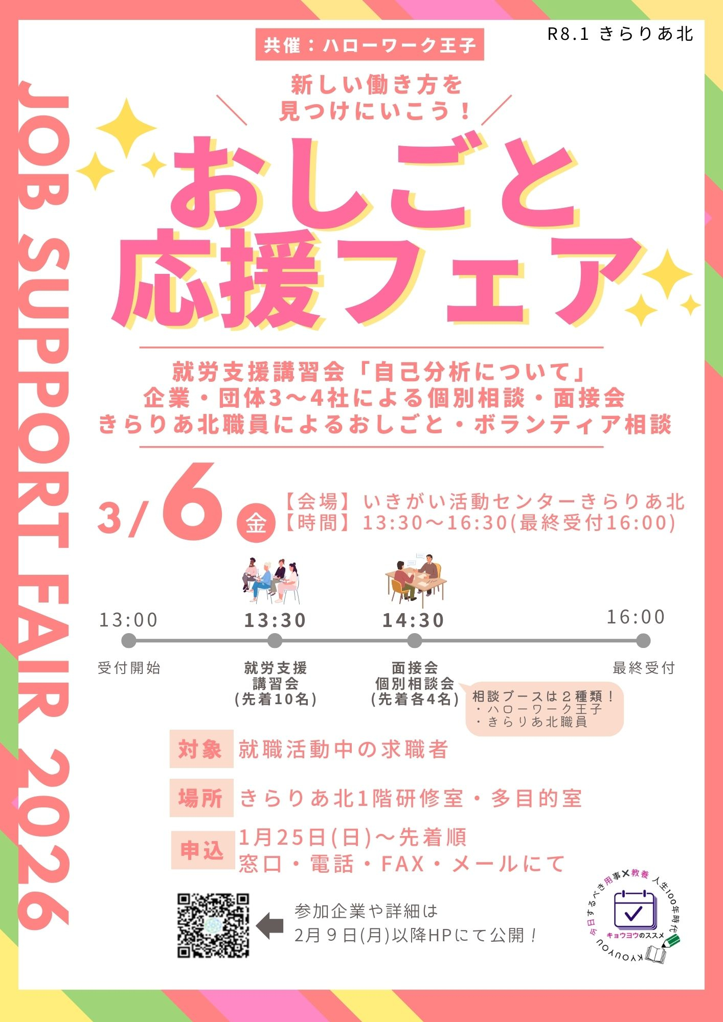 2026.01.25 お知らせ 3月6日おしごと応援フェア開催します! Tweet シェアする 前の記事 2026.01.25 お知らせ 2/28(土)きらりあマルシェ🧶ハンドメイドコーナー🧶 次の記事 2026.01.25 お知らせ 【介護予防のお知らせ2月号】 一覧へ戻る