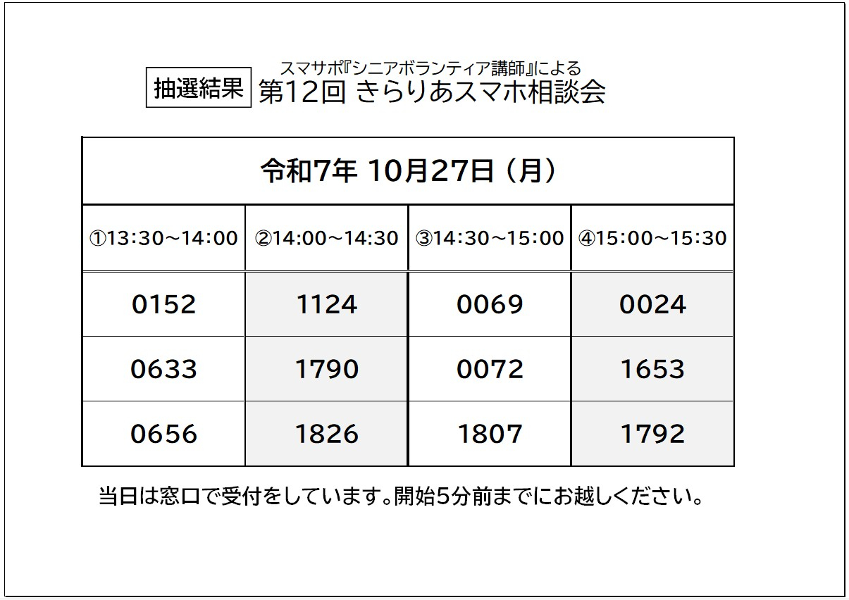 2025.10.12 お知らせ 第12回きらりあスマホ相談会【10/27(月)】抽選結果 Tweet シェアする 第12回きらりあスマホ相談会【10/27(月)】抽選結果 10/27(月)開催のスマホ相談会の当選発表させていただきます。 お申込みされた方は、ご確認をお願いいたします。 就労支援 N.U 一覧へ戻る