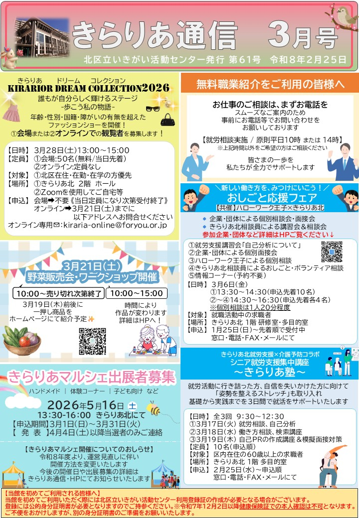 2026.02.25 お知らせ 【きらりあ通信3月号】 Tweet シェアする 【きらりあ通信3月号】 きらりあ通信3月号を発行しました‼ きらりあ通信3月号では、講座開催のお知らせや就労に関するお役立ち情報、求人情報等を掲載しています。 是非ともご覧ください☆ 一覧へ戻る