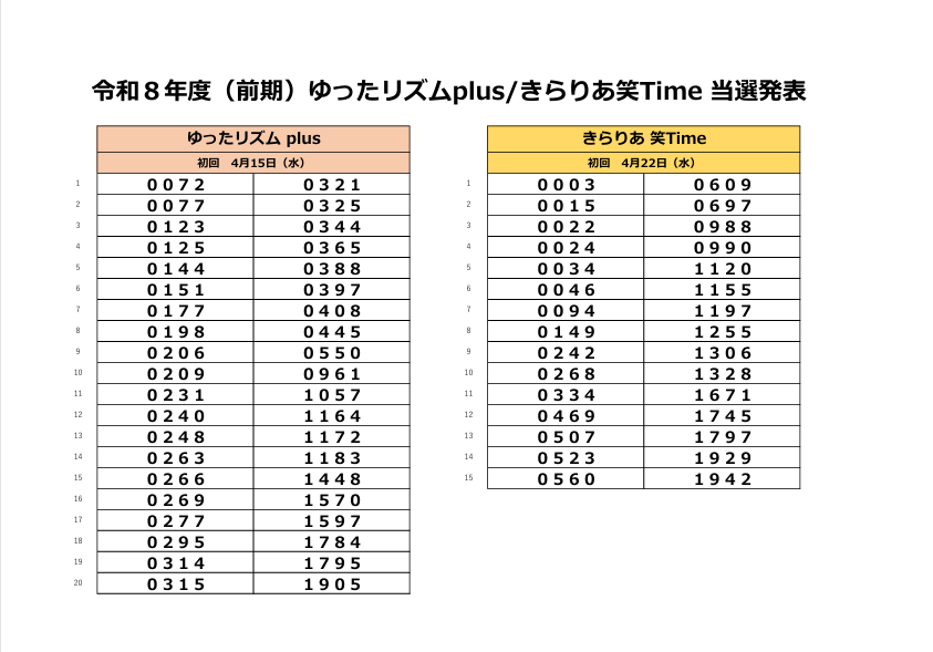 2026.03.25 お知らせ 令和8年度 前期ゆったリズムplus /きらりあ笑Time当選発表 Tweet シェアする 令和8年度 前期ゆったリズムplus/きらりあ笑Time 当選発表 「ゆったリズムplus」と「きらりあ笑Time」の当選結果を発表させていただきます。 ご確認お願いいたします。 一覧へ戻る