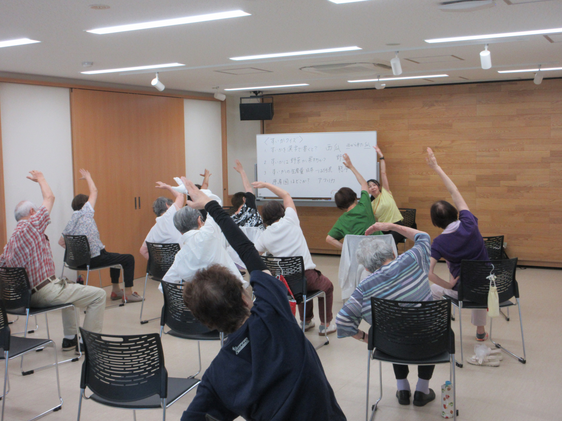 先生のパンチのある声に導かれて、肩、背中、脇腹などタップリ伸ばしました。