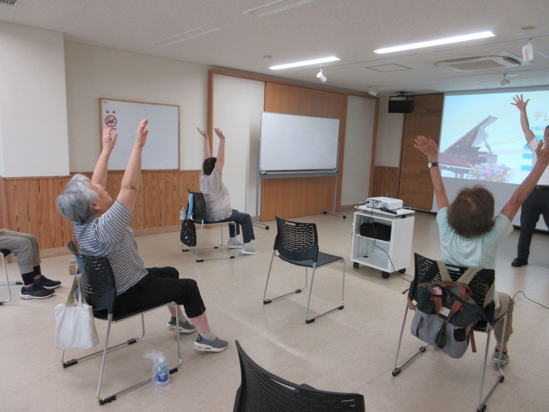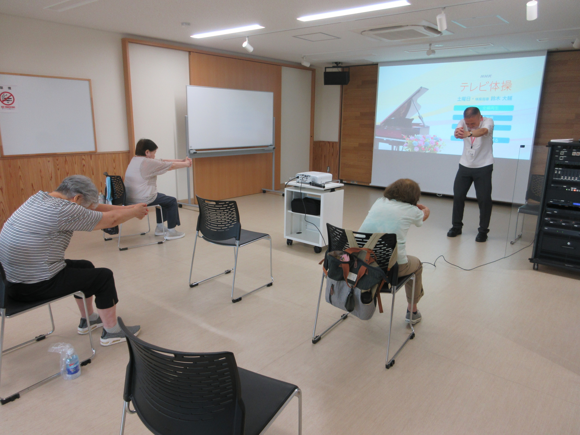 本日のラジオ体操は、当館で最も広いお部屋を使用し、大きなスクリーンに映像を映して行いました。