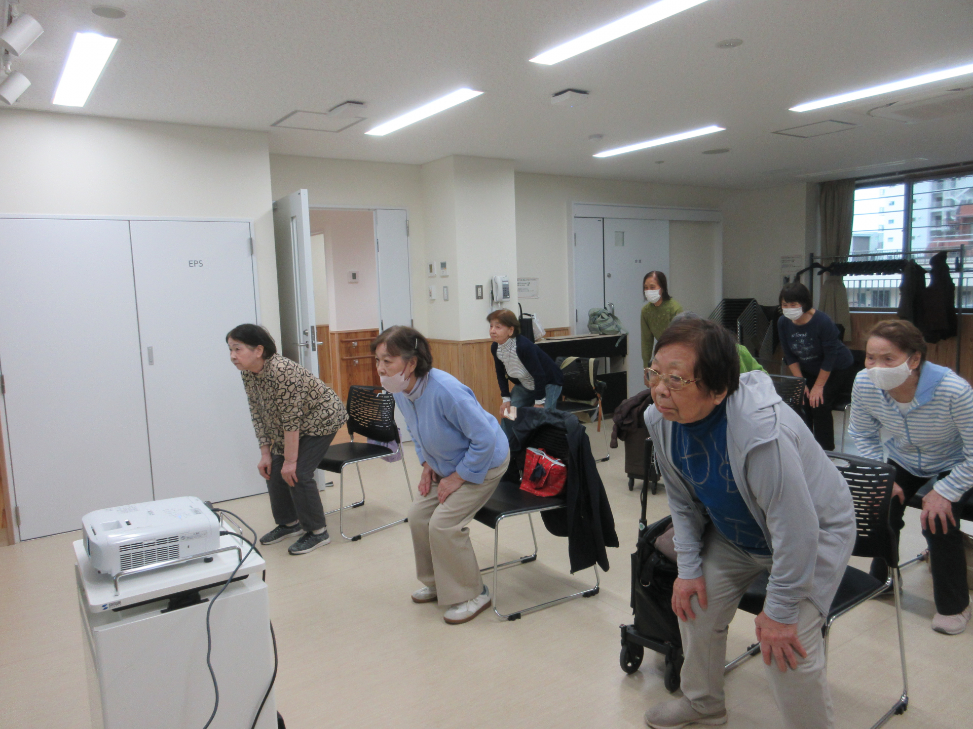 後半は、スクリーンに映した映像を見ながら、少しきつめですが、しっかりと足腰を鍛える「フレイル予防体操」皆さんと行いました。