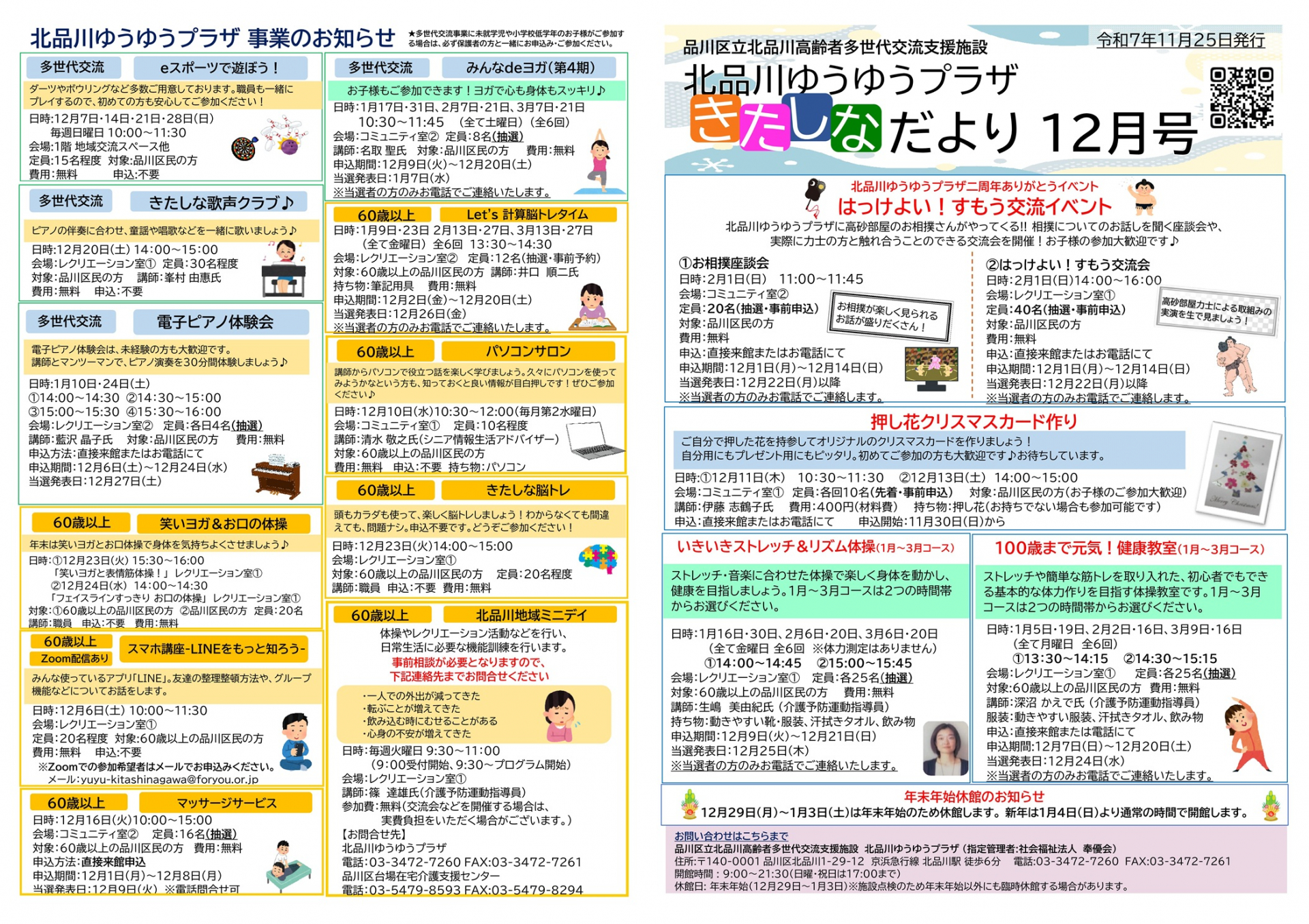 2025.11.25 お知らせ きたしなだより12月号 Tweet シェアする きたしなだより12月号を発行しました! PDF版はコチラからご確認ください #きたしなだより 前の記事 2025.11.26 お知らせ 11月25日デコパージュサロン(1回目)を開催しました。 次の記事 2025.11.24 お知らせ 今日も元気!フォーユー体操を実施しました 一覧へ戻る