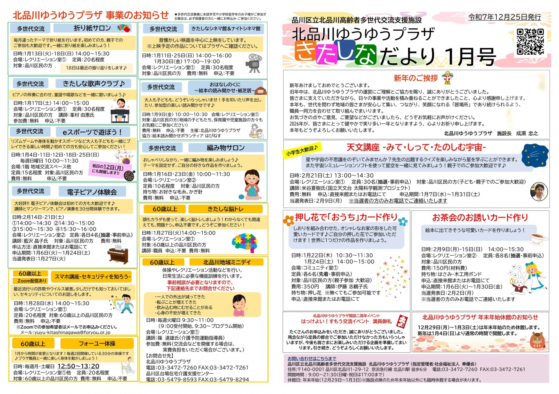 2025.12.25 お知らせ きたしなだより1月号 Tweet シェアする きたしなだより1月号を発行しました! PDF版はコチラからご確認ください #きたしなだより 前の記事 2025.12.25 お知らせ 年末年始休館のお知らせ 次の記事 2025.12.24 お知らせ フェイスラインすっきり!お口の体操 一覧へ戻る