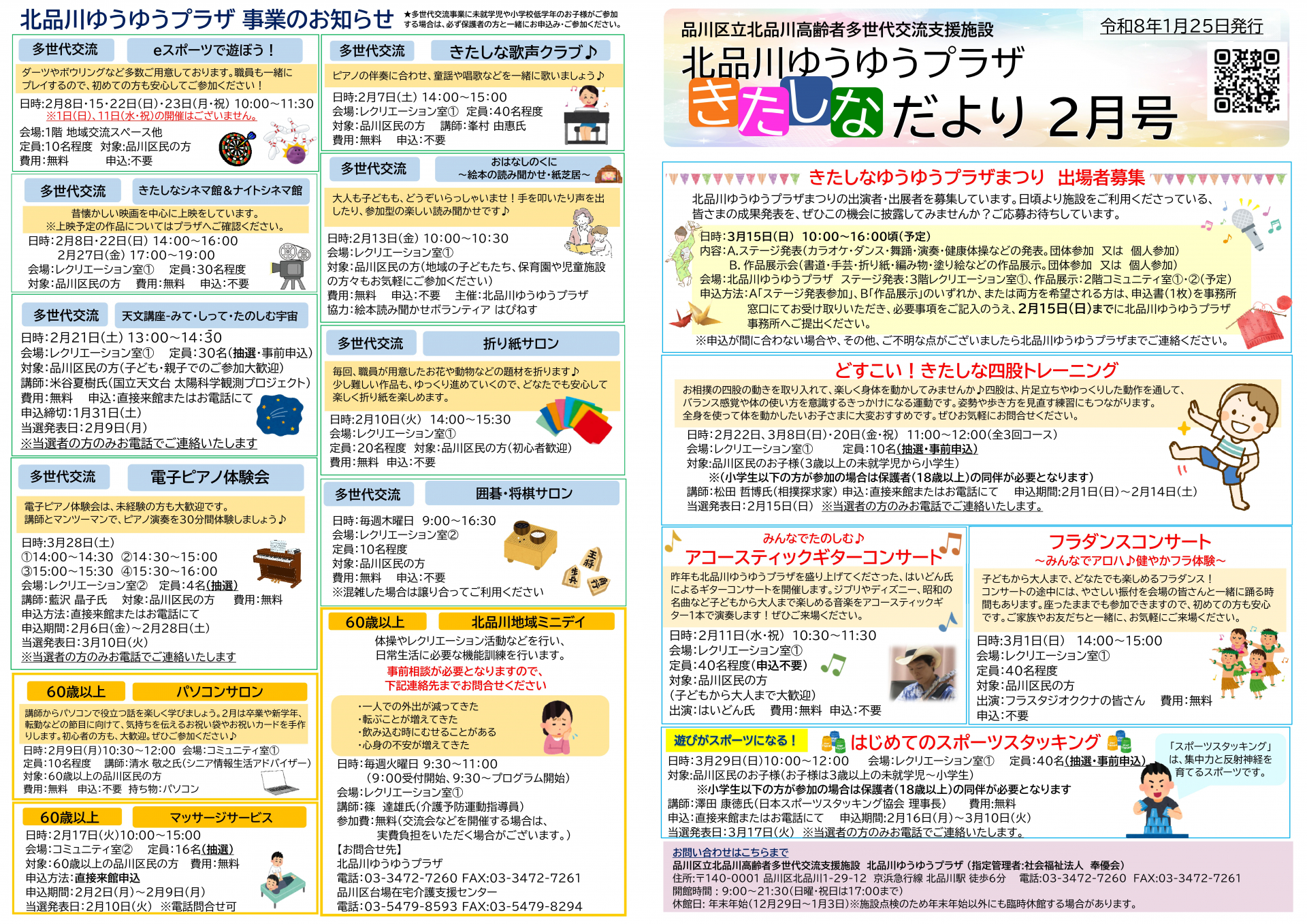2026.01.25 お知らせ きたしなだより2月号を発行しました! Tweet シェアする 毎月25日は、北品川ゆうゆうプラザの広報誌「きたしなだより」の発行日です。 PDF版はこちらからご覧いただけます。 2月も北品川ゆうゆうプラザへご来館お待ちしております。 北品川ゆうゆうプラザ 成瀬 #きたしなだより #2月号 次の記事 2026.01.24 お知らせ ✿押し花「おうち」カード作り✿ 一覧へ戻る