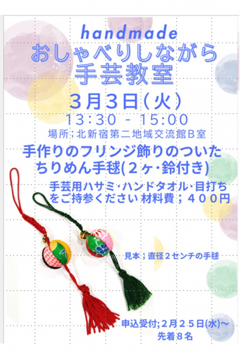 2025.12.04 NEW 英語復習 活動報告 2025.12.04 NEW 手芸 タオル装飾 活動報告 2025.12.04 NEW 英語講座 活動報告 2025.12.04 NEW 冬の乾燥対策:保湿の工夫と習慣 お知らせ 2025.12.03 100トレ貯筋スタンプ達成 活動報告 2025.12.03 モルック 活動報告 2025.12.03 スローエアロビクス 活動報告 2025.12.03 手芸教室レポート 活動報告 2025.12.02 インフルエンザ流行中!冬を元気に過ごすための予防ポイント お知らせ 2025.12.02 健康保険証の期限と、初めてご利用される方へのご案内 お知らせ 2025.12.02 はじめての吹矢体験 集中と爽快感を味わいました 活動報告 2025.12.02 健康習慣 活動報告 2025.12.02 公園の木々が冬支度をはじめました お知らせ 2025.12.02 楽しむ韓国語 活動報告 2025.12.02 やさしい韓国語 活動報告 1 2 3 … 65