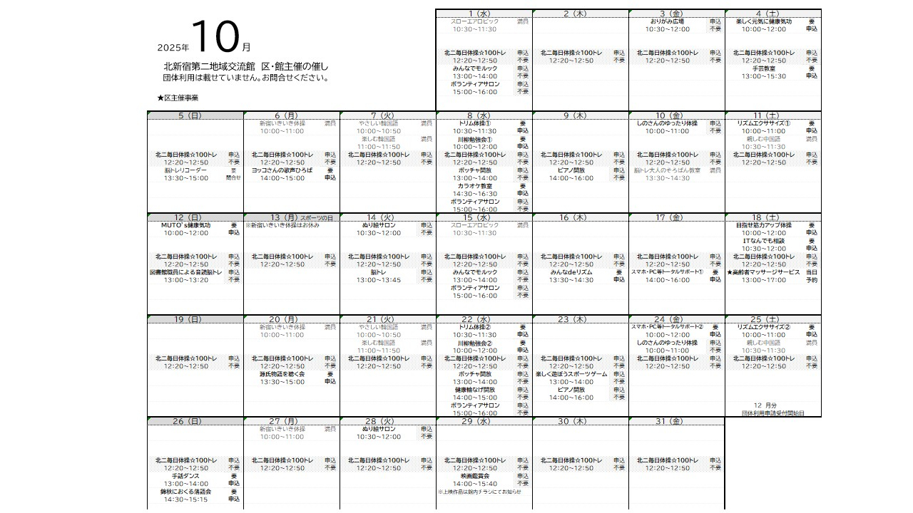 2025.09.21 お知らせ 10月館だより Tweet シェアする 10月館だよりのお知らせです。 事前のお申込みは9/25(木)AM9:00です。 前の記事 2025.09.21 お知らせ 季節の変わり目の健康管理 ~風邪予防のポイント~ 次の記事 2025.09.20 お知らせ ITなんでも相談 一覧へ戻る