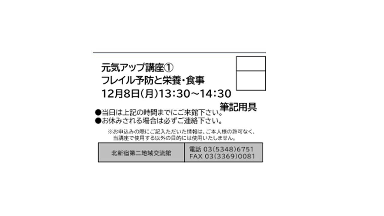 2025.12.08 お知らせ 12月 講座空き枠のお知らせ① Tweet シェアする 空き枠がございます。是非ご参加ください。 前の記事 2025.12.08 お知らせ 12月 講座空き枠のお知らせ② 次の記事 2025.12.08 お知らせ スマホ、PCサポート空き枠のご案内 一覧へ戻る