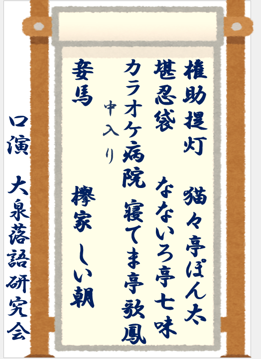 お馴染みの大泉落語研究会の皆さまをお迎えして、落語四席で 大いに笑っていただきました。