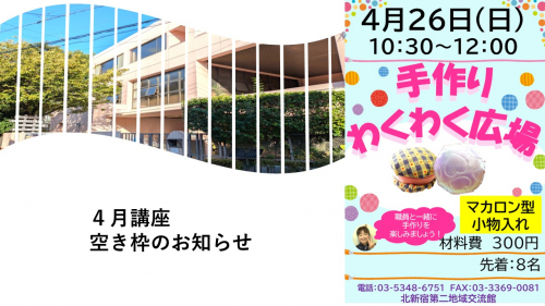 2026.03.25 お知らせ 4月講座お申込み受付中!⑦ Tweet シェアする 前の記事 2026.03.25 お知らせ 4月講座お申込み受付中!⑧ 次の記事 2026.03.25 お知らせ 4月講座お申込み受付中!⑤ 一覧へ戻る