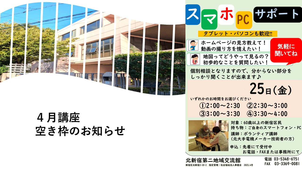 2026.03.25 お知らせ 4月講座お申込み受付中!⑬ Tweet シェアする 前の記事 2026.03.27 お知らせ しのさんのゆったり体操 次の記事 2026.03.25 お知らせ 4月講座お申込み受付中!⑫ 一覧へ戻る