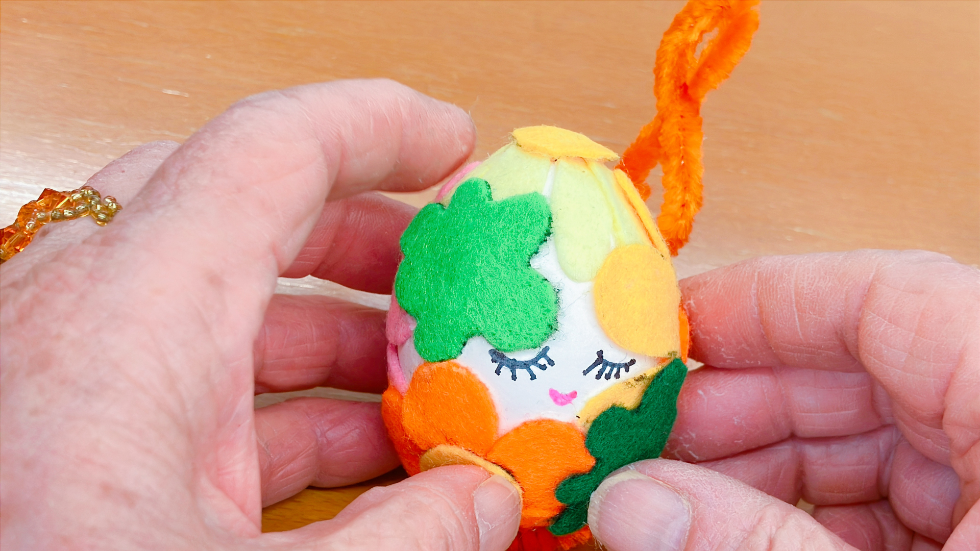 たまごの殻にフェルトを貼り付け、お顔をかいて飾りつけをして完成です。