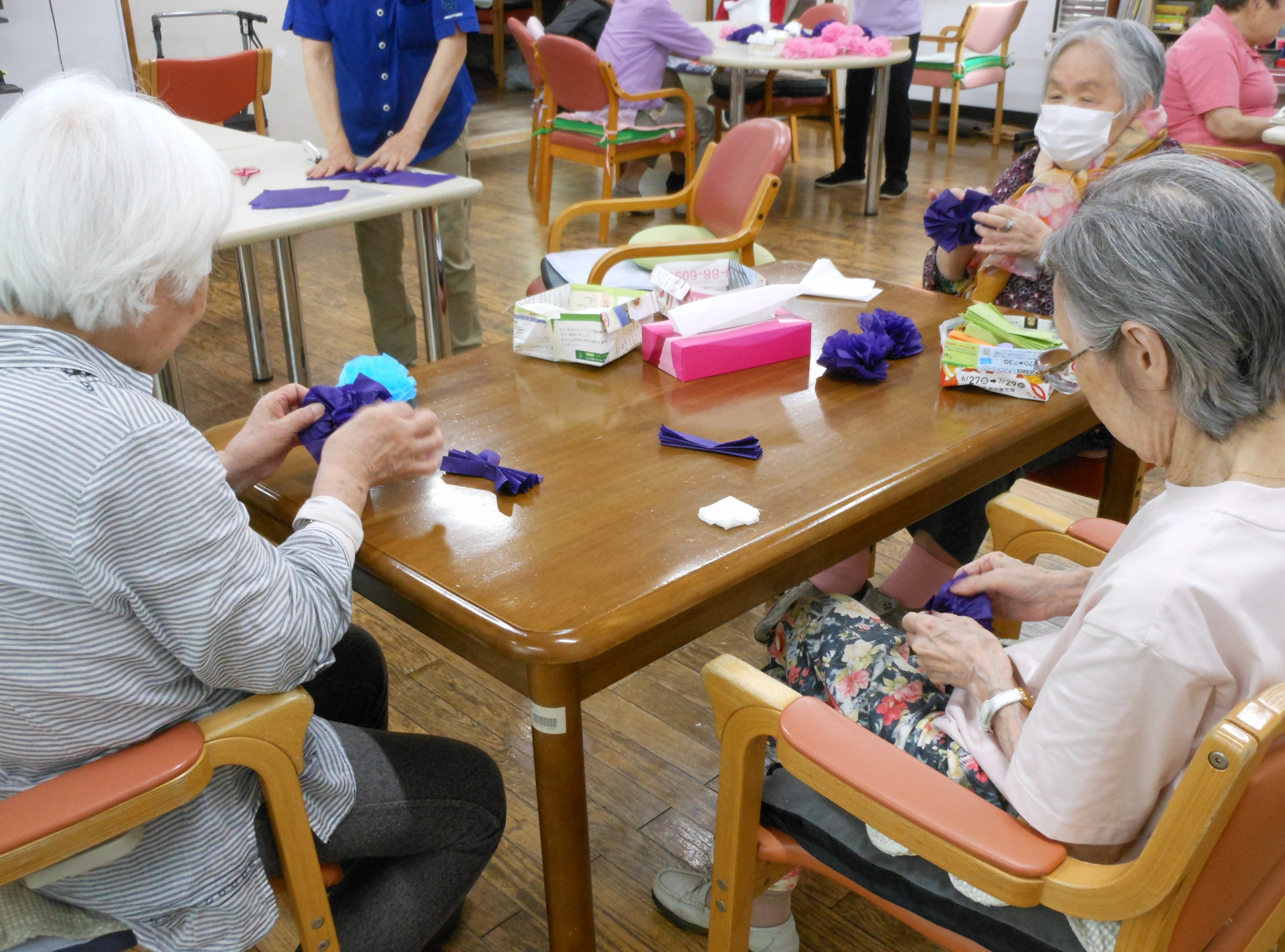 色とりどりの紙を使って沢山の花を皆様で協力し合って作り上げておりました。