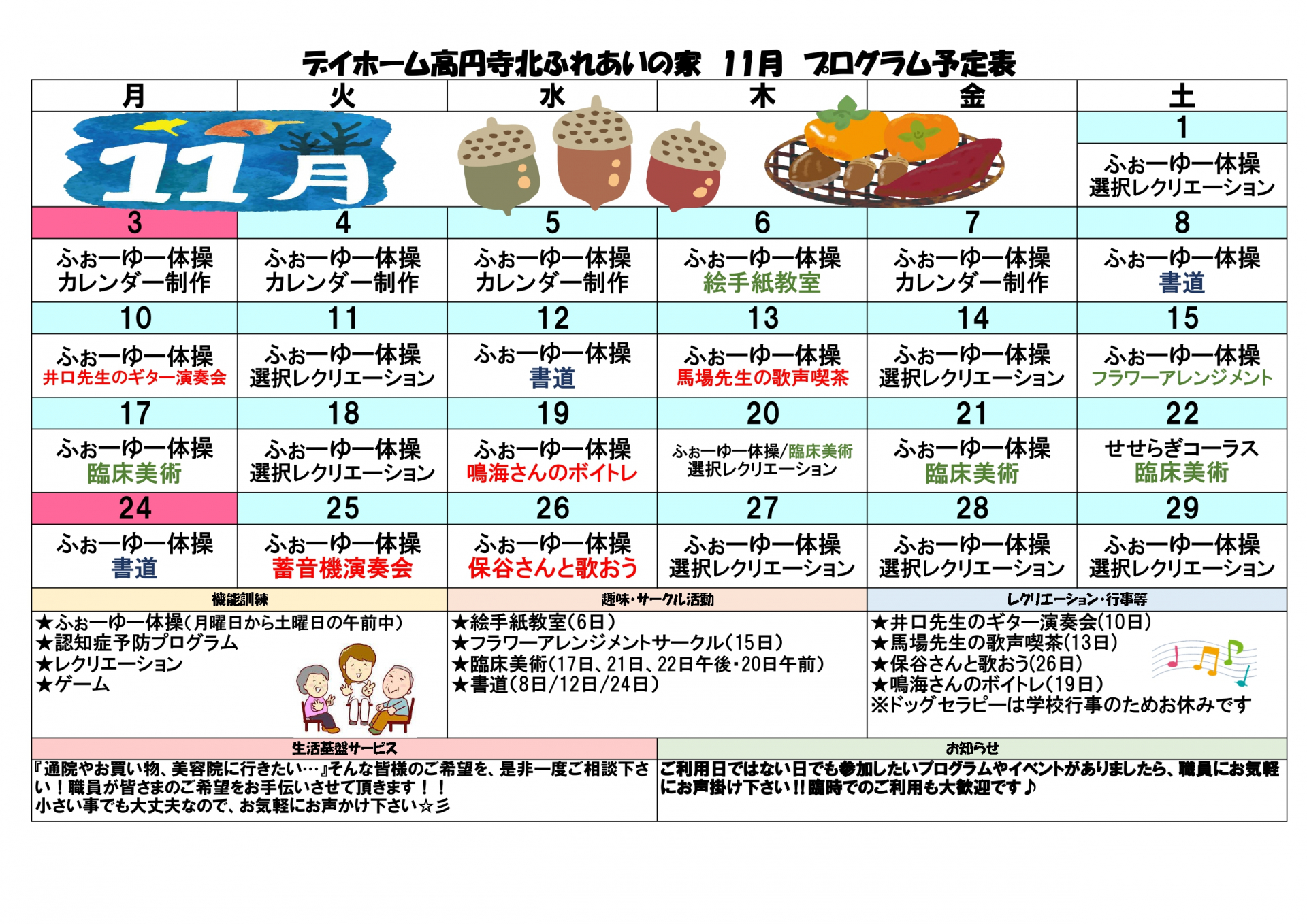 2025.11.01 お知らせ 【高円寺デイ】★11月のプログラム★ Tweet シェアする ☆デイホーム高円寺北ふれあいの家☆\令和7年11月のプログラム表です/気になるプログラムがありましたら、遠慮なく職員までお声掛けください! #デイサービス #デイ #介護 #福祉 #奉優会 #デイホーム高円寺北ふれあいの家 #11月のプログラム 前の記事 2025.11.01 お知らせ 【高円寺デイ】★11月の献立★ 次の記事 2025.10.29 お知らせ 【高円寺デイ】秋の大運動会~プログラムカード~ 一覧へ戻る