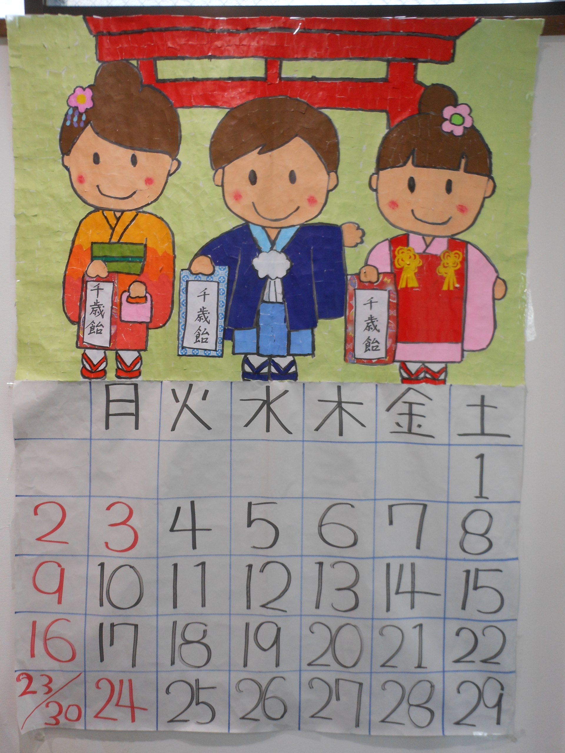 デイホーム高円寺北ふれあいの家で毎月皆様と共に作成している壁の手作りカレンダーを見ると、七五三の絵に何だかホッと一安心します。