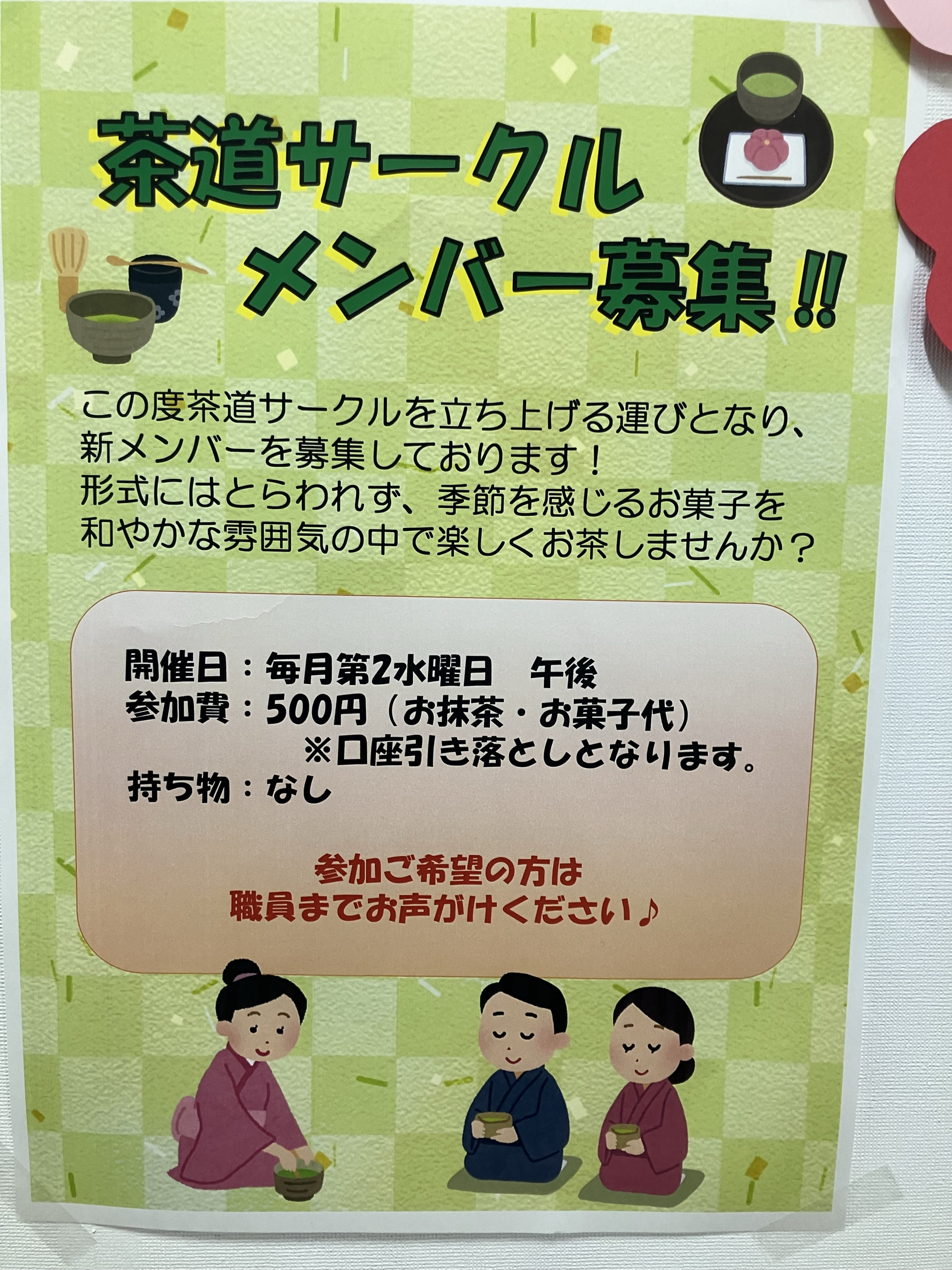 2月より月1回水曜日に「茶道サークル」を開始いたします。