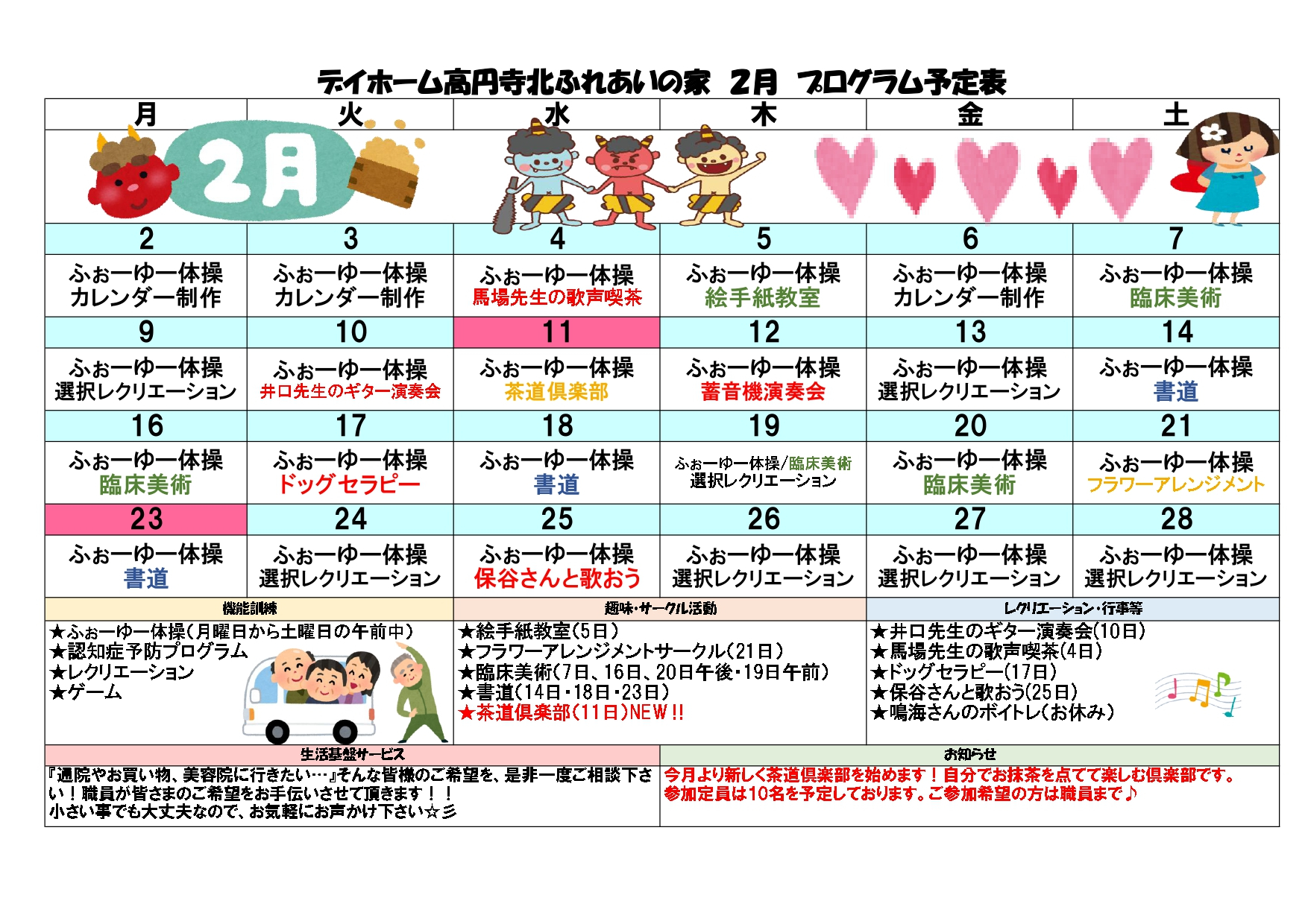 2026.02.02 お知らせ 【高円寺デイ】★2月のプログラム★ Tweet シェアする ☆デイホーム高円寺北ふれあいの家☆\令和8年2月のプログラム表です/気になるプログラムがありましたら、遠慮なく職員までお声掛けください! #デイサービス #デイ #介護 #福祉 #奉優会 #デイホーム高円寺北ふれあいの家 #2月のプログラム 前の記事 2026.02.02 お知らせ 【高円寺デイ】★2月の献立★ 次の記事 2026.01.31 お知らせ 【高円寺デイ】フラワーアレンジメント(2) 一覧へ戻る