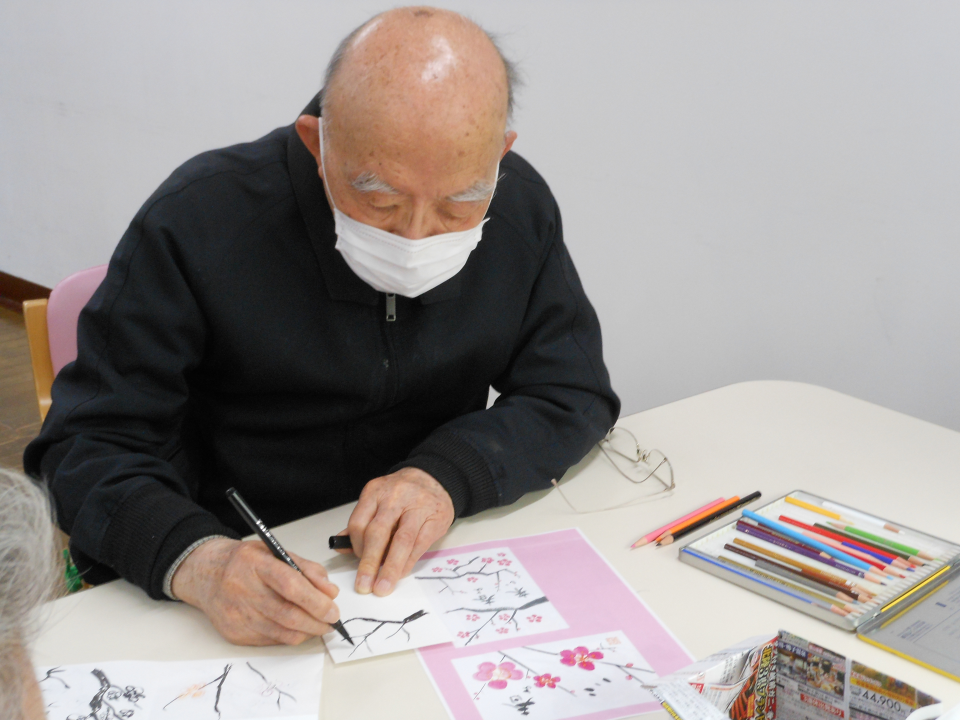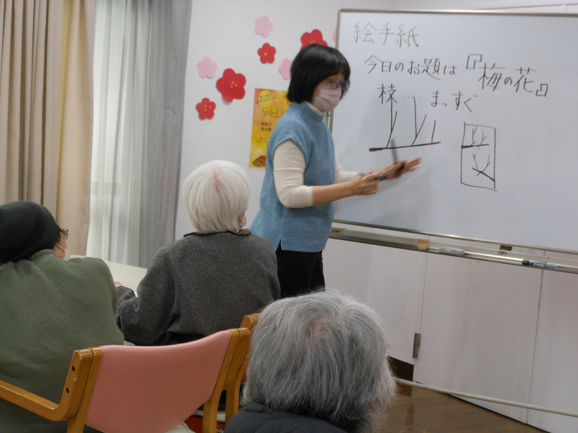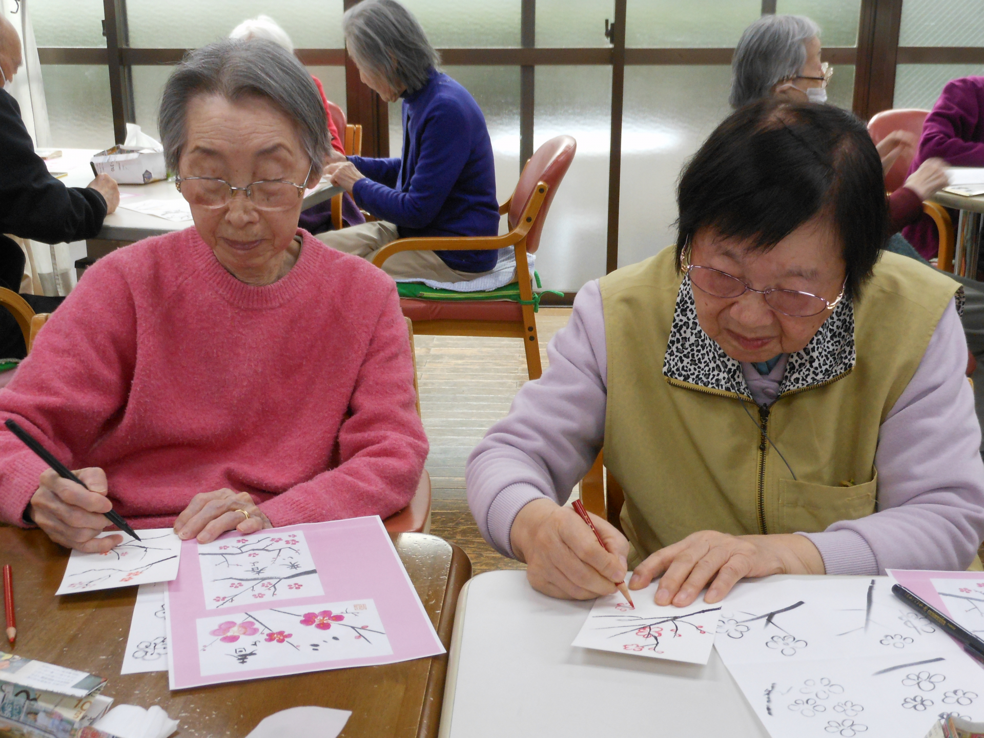 本番はハガキに各々が思う梅の花を描き進めます。隣席の方と書き方を確認しながら進める方もいれば