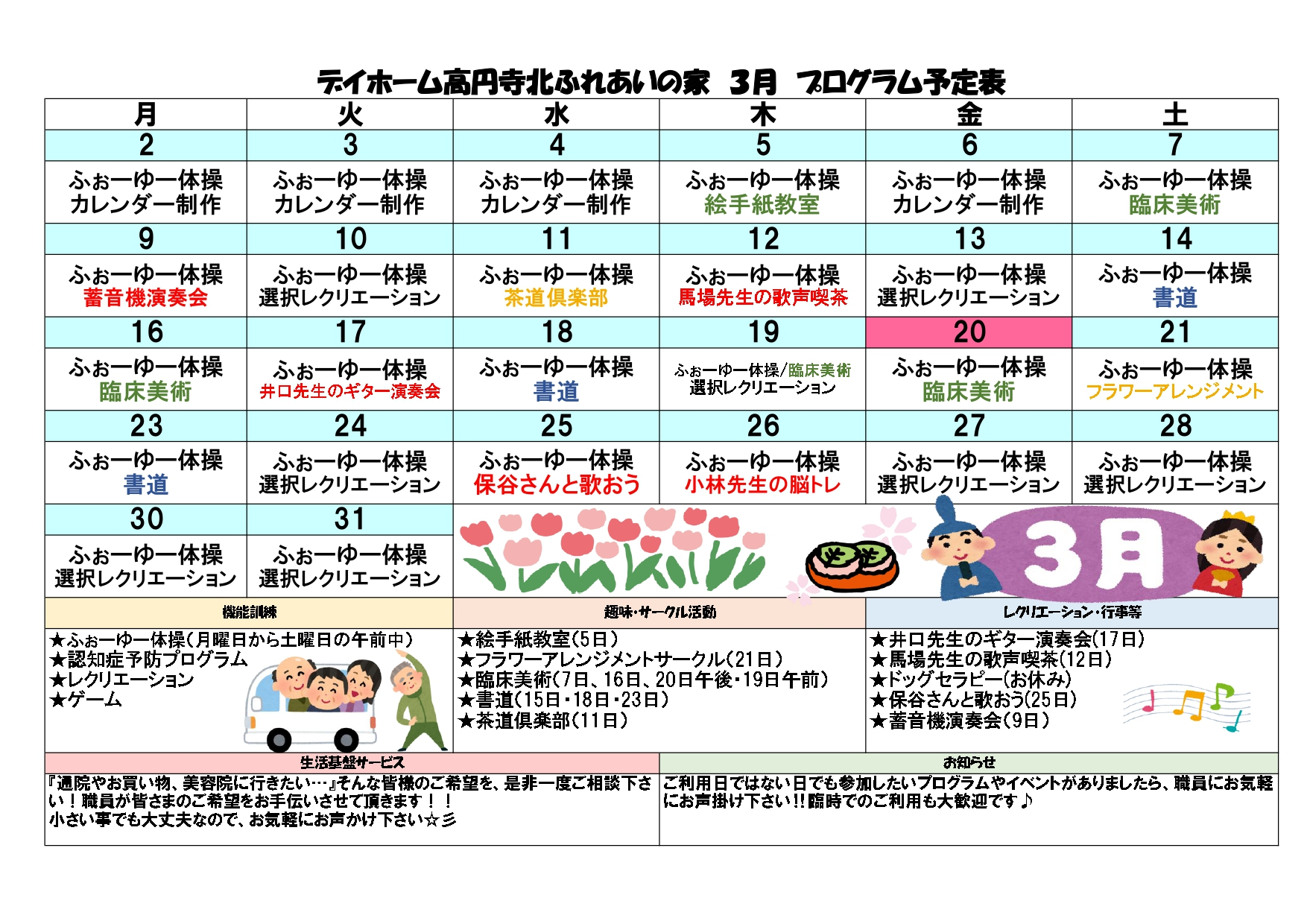 2026.03.02 お知らせ 【高円寺デイ】★3月のプログラム★ Tweet シェアする ☆デイホーム高円寺北ふれあいの家☆\令和8年3月のプログラム表です/気になるプログラムがありましたら、遠慮なく職員までお声掛けください! #デイサービス #デイ #介護 #福祉 #奉優会 #デイホーム高円寺北ふれあいの家 #3月のプログラム 前の記事 2026.03.02 お知らせ 【高円寺デイ】★3月の献立★ 次の記事 2026.02.27 お知らせ 【高円寺デイ】おやつイベント第二弾~肉まん~ 一覧へ戻る