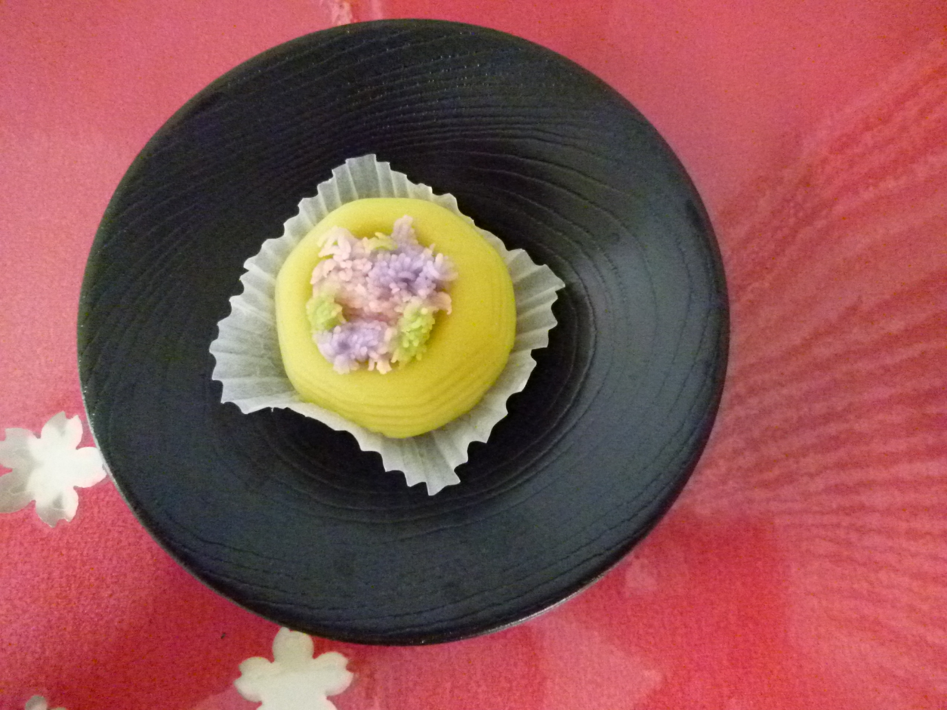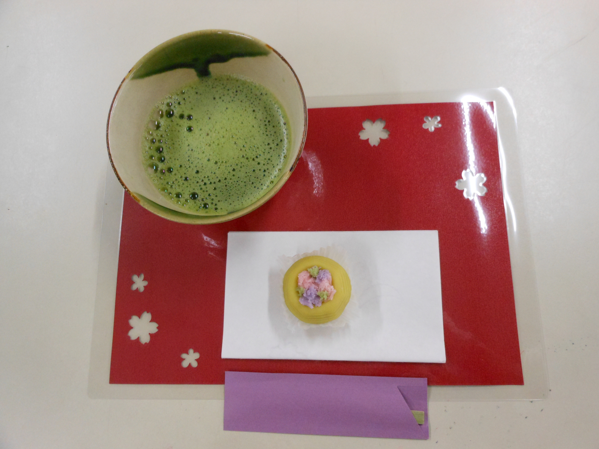 本日の和菓子は『はなかご』です。春を感じる優しい色合いで抹茶にピッタリでした。