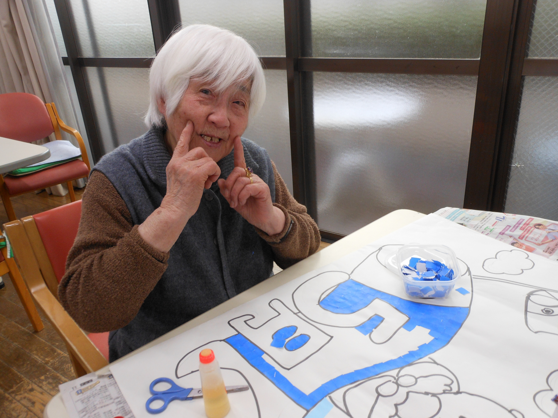 毎月玄関前に飾られている特大カレンダーですが、こちらは毎月、ご利用者様方の貼り絵による共同制作です。