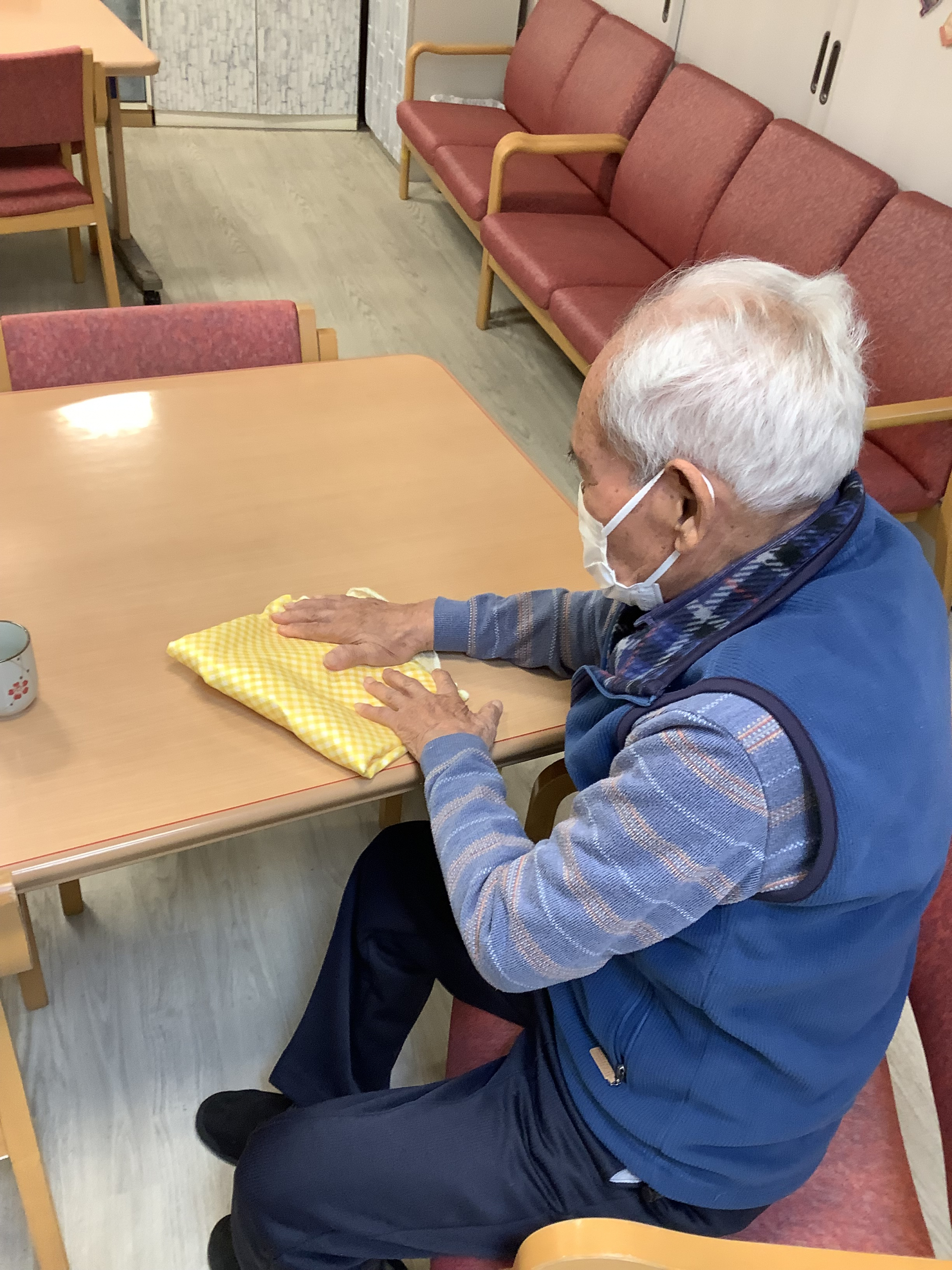 朝一でご来所されるH様はエプロンを取り込み、畳む担当をお願いしております。