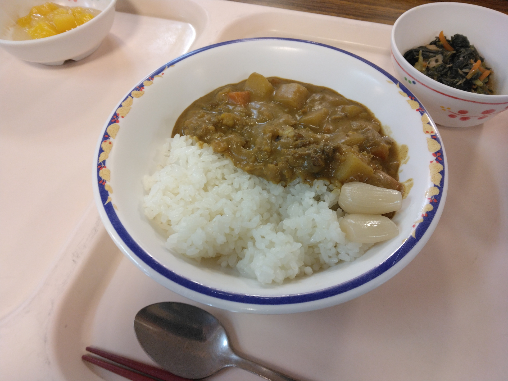 ビーフカレーにほうれん草とツナのソテー、黄桃缶のピーチジュレといった献立でした!