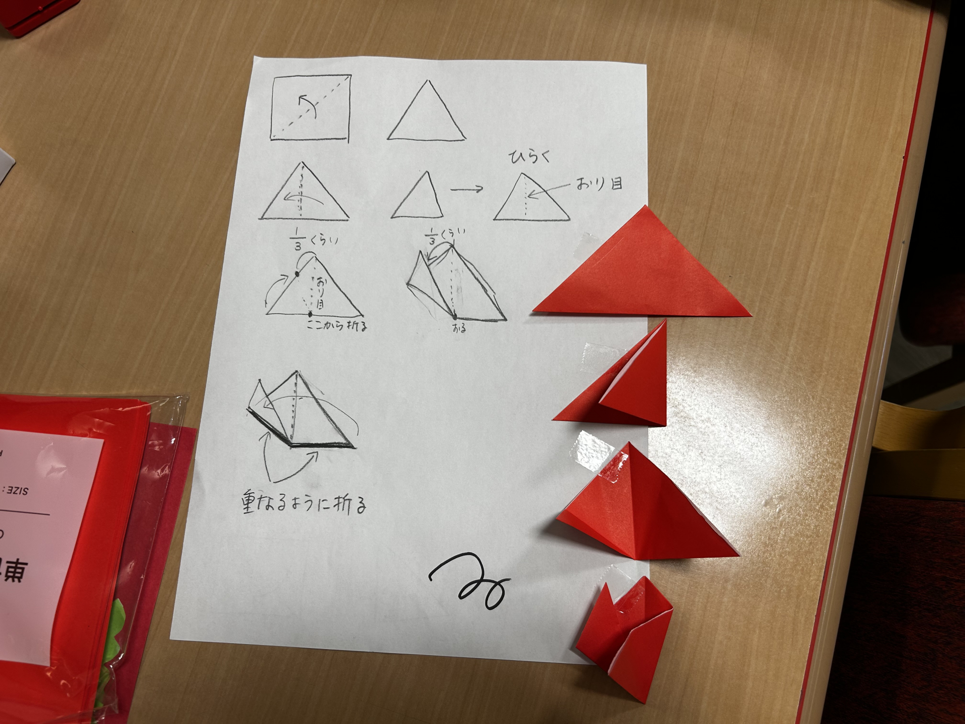 K職員が折り方を調べて手書きで分かりやすく書いてくれたので、皆さまもうまく折り紙を折ることができました!