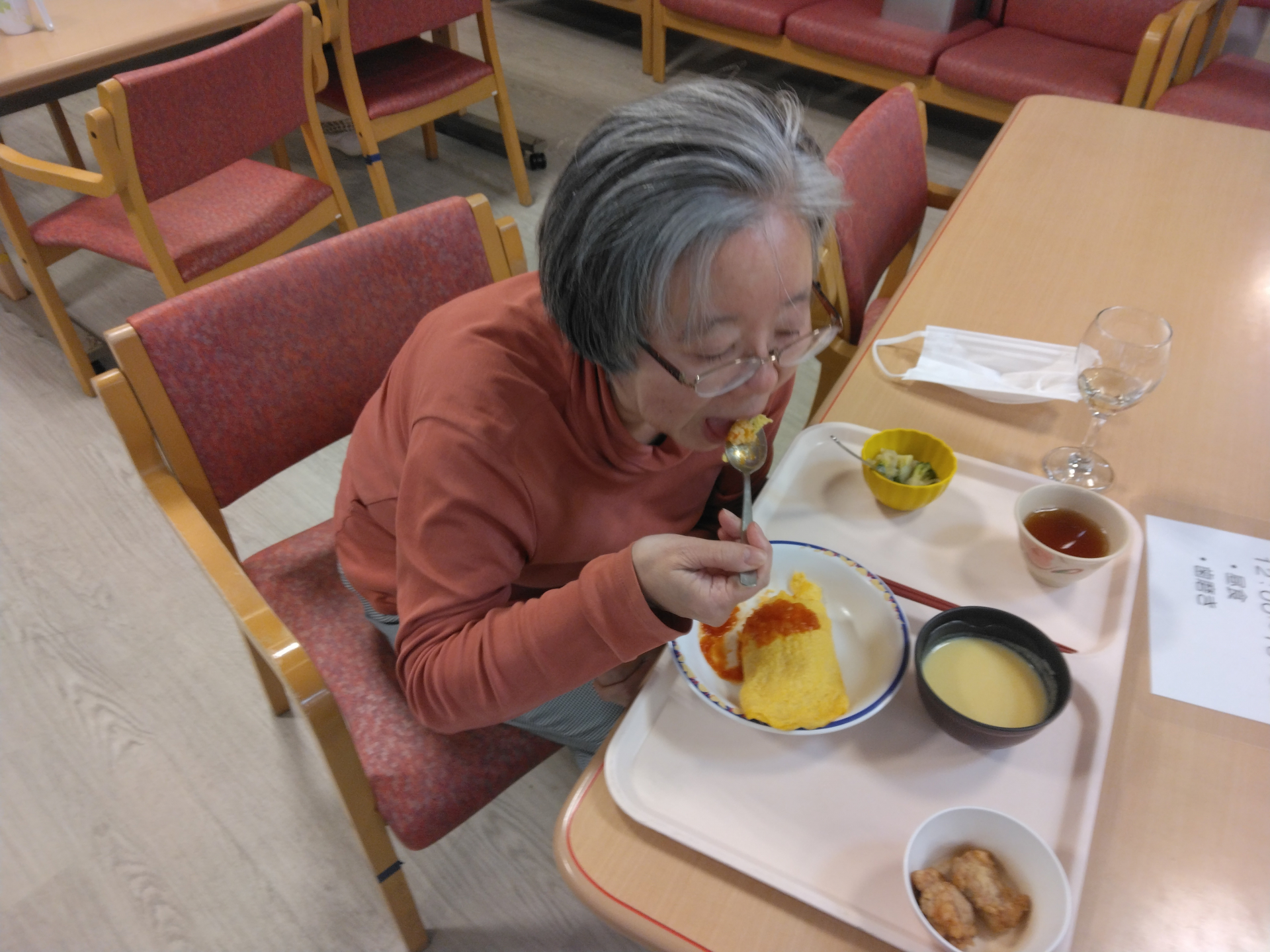 クリスマスにはチキン!ということで、本日の昼食はオムライスや鶏の唐揚げなど、鶏肉を使った人気メニューをご用意いたしました。ブロッコリーの洋風お浸しとコーンポタージュスープもセットです。