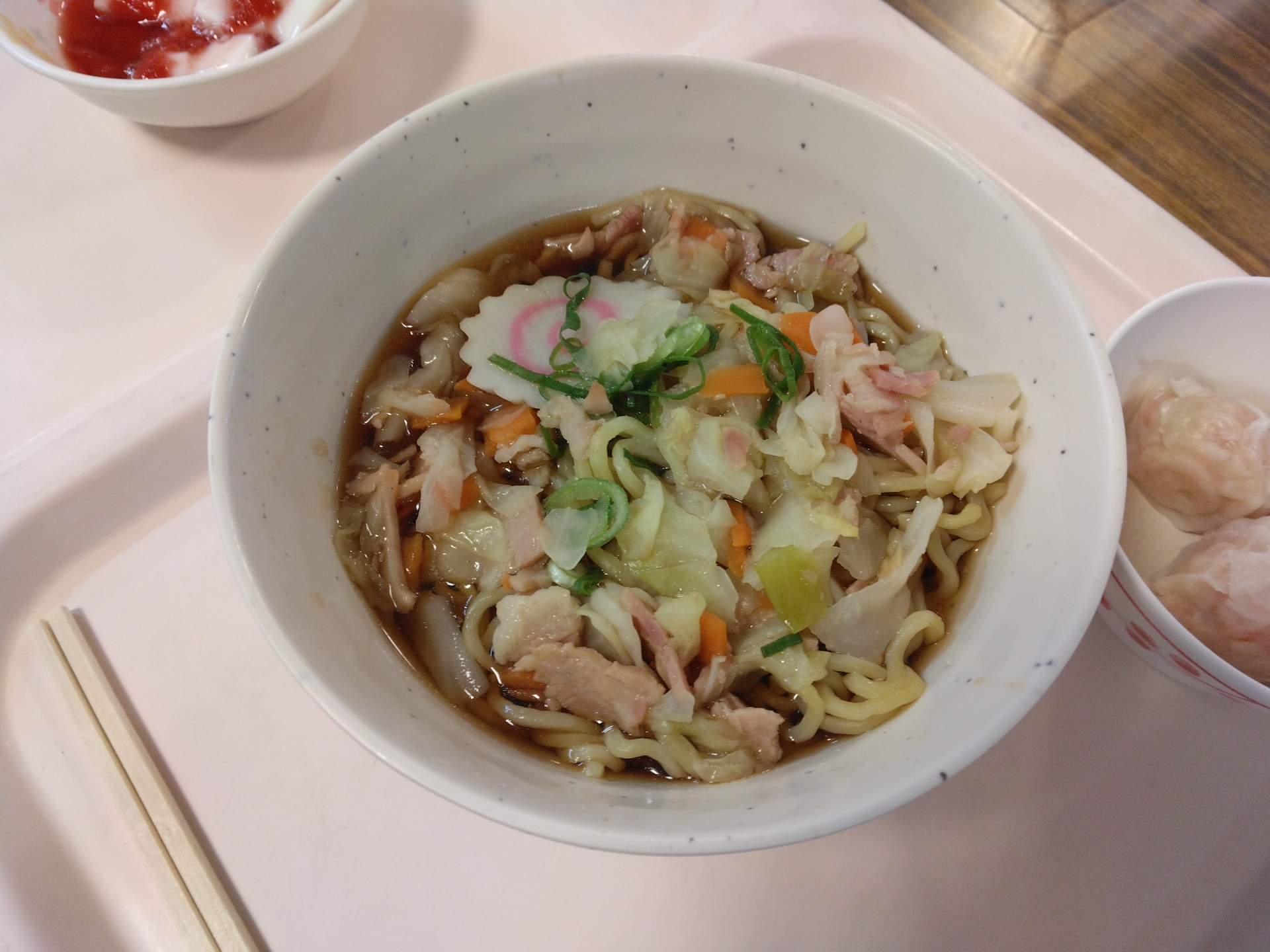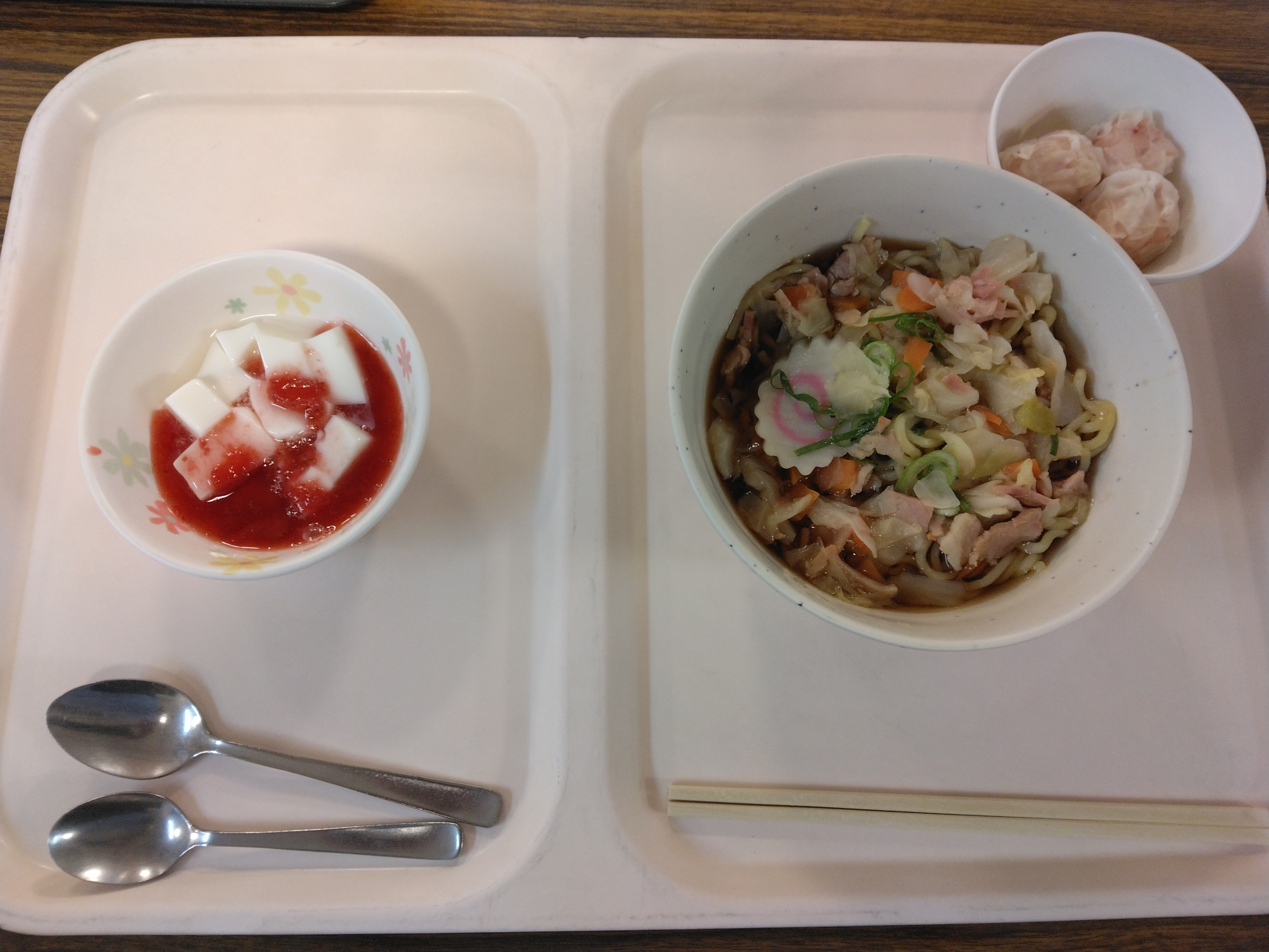 本日の献立は醬油ラーメン、かにシューマイ、杏仁豆腐(いちごソース)といった組み合わせでした!