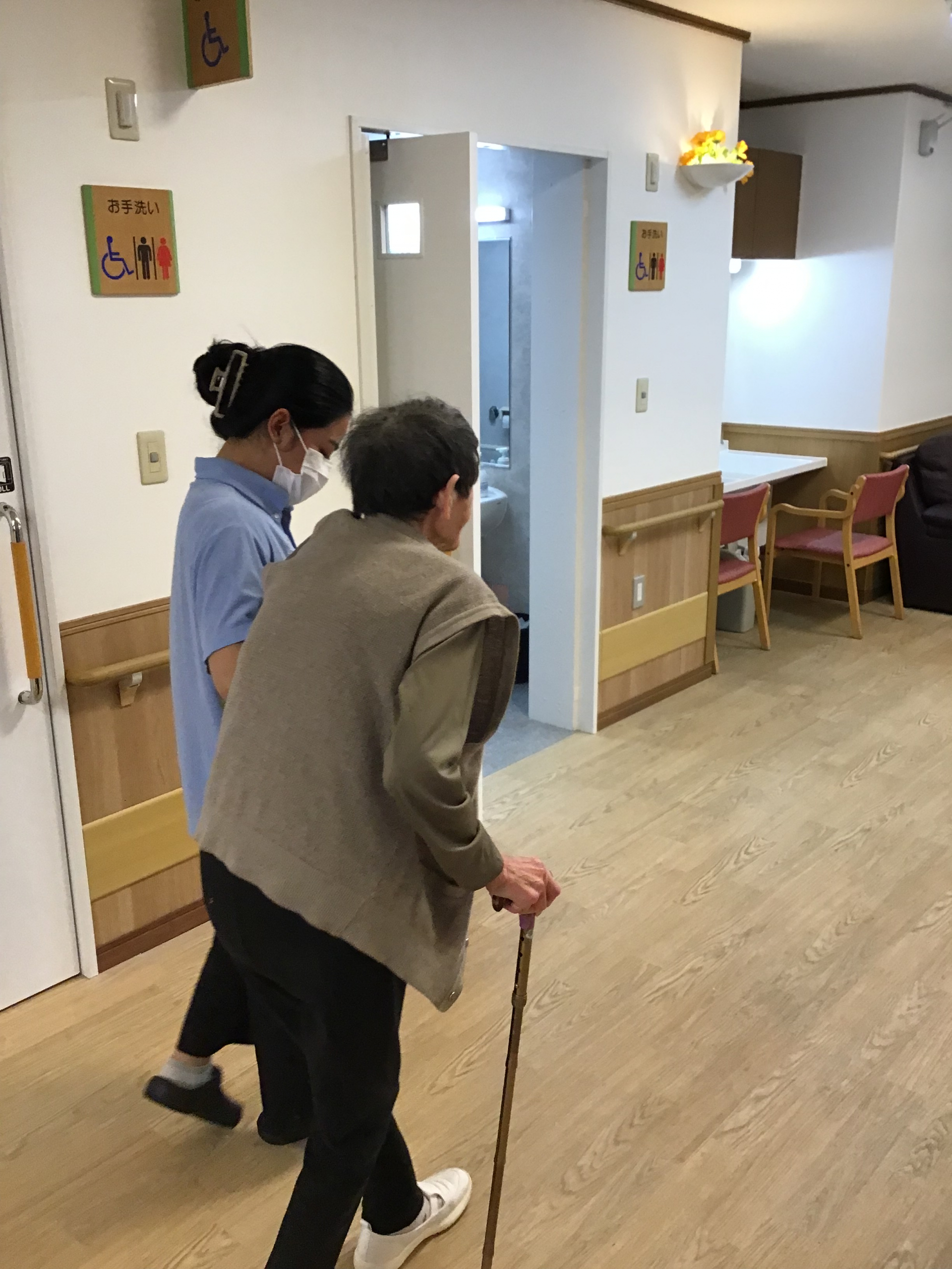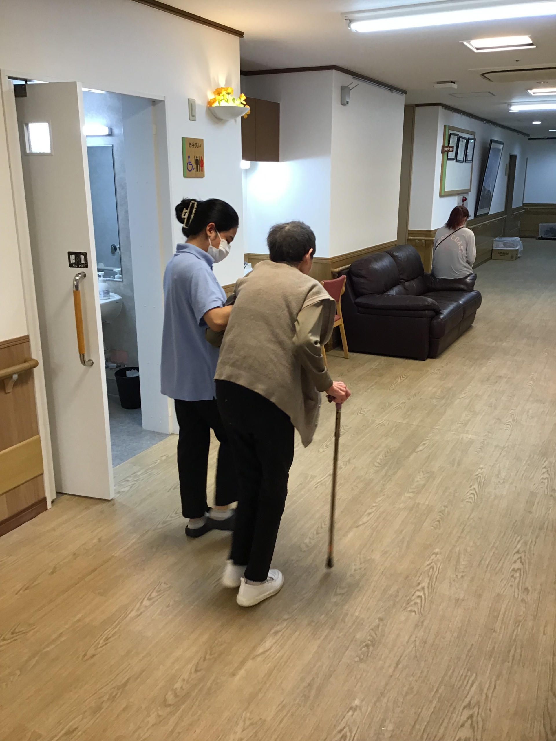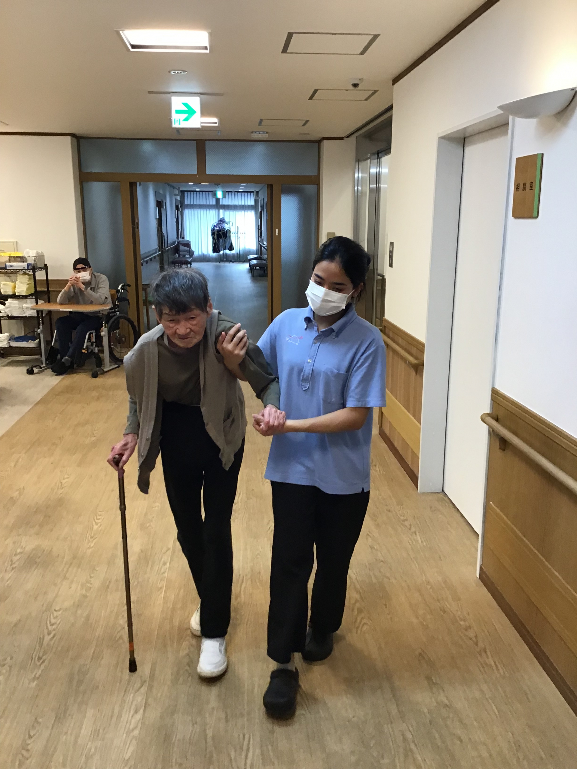 円背(猫背)になりがちなSさまですが、なるべく背中を伸ばしてお顔を上げていただいて、良い姿勢で廊下を3往復歩いていただきましたよ~♪