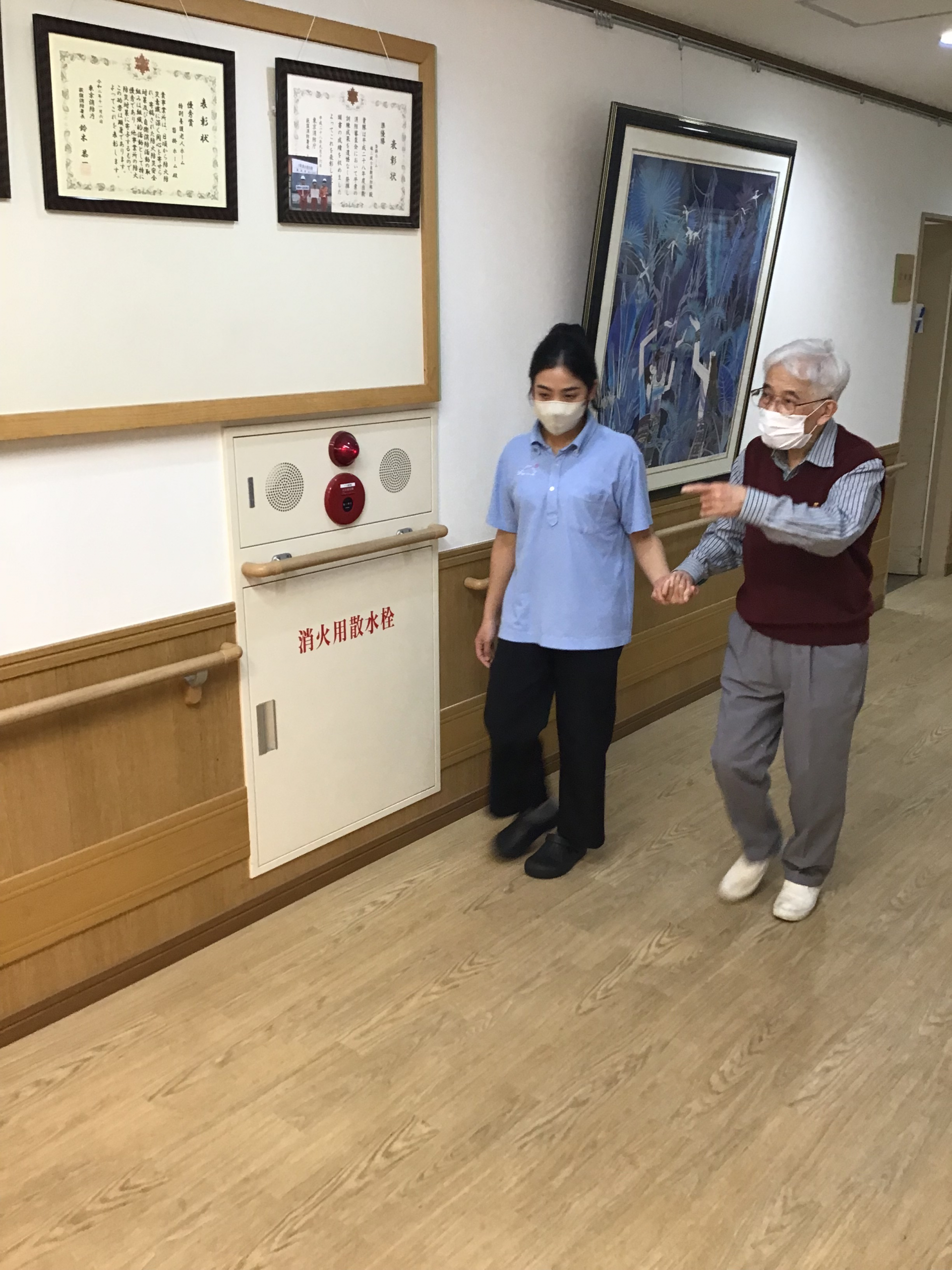 歩行訓練、個別に行う機能訓練として日頃から皆さまをお誘いしている廊下歩行ですが、気分転換にもピッタリ!