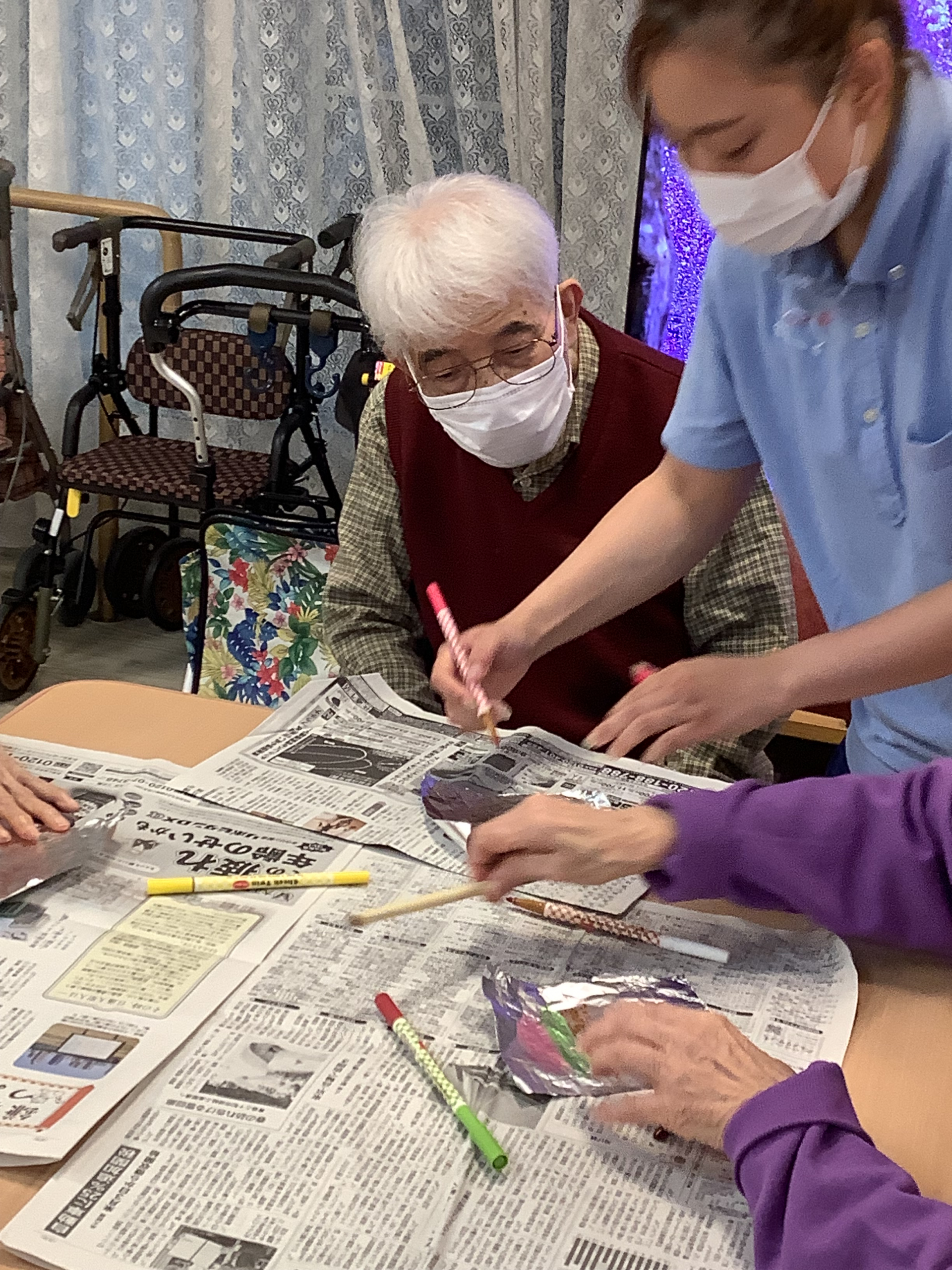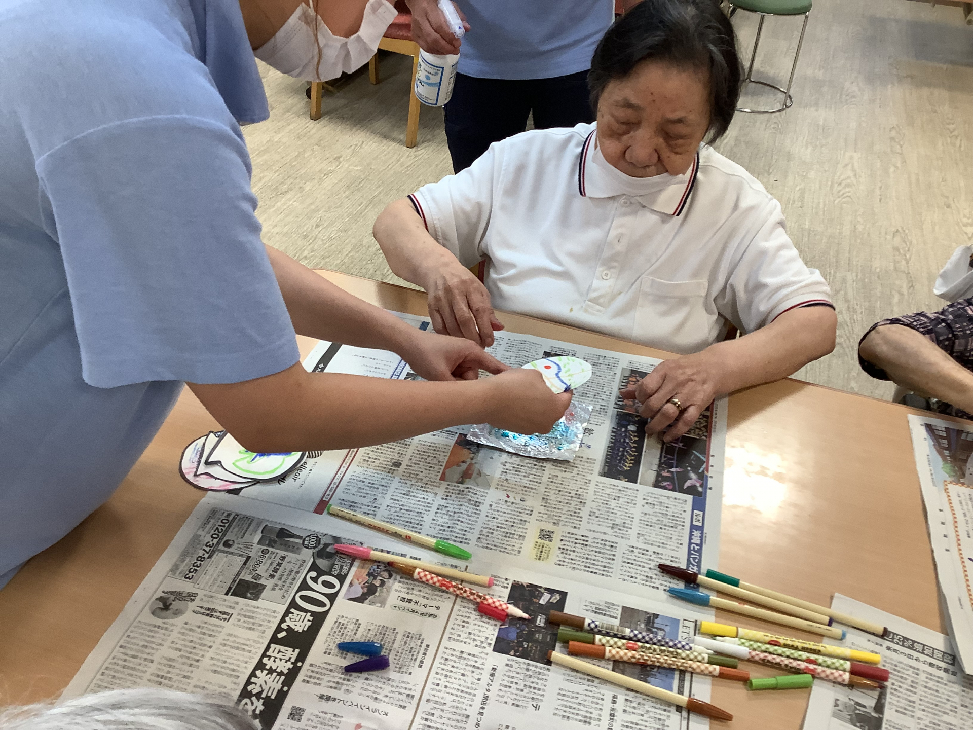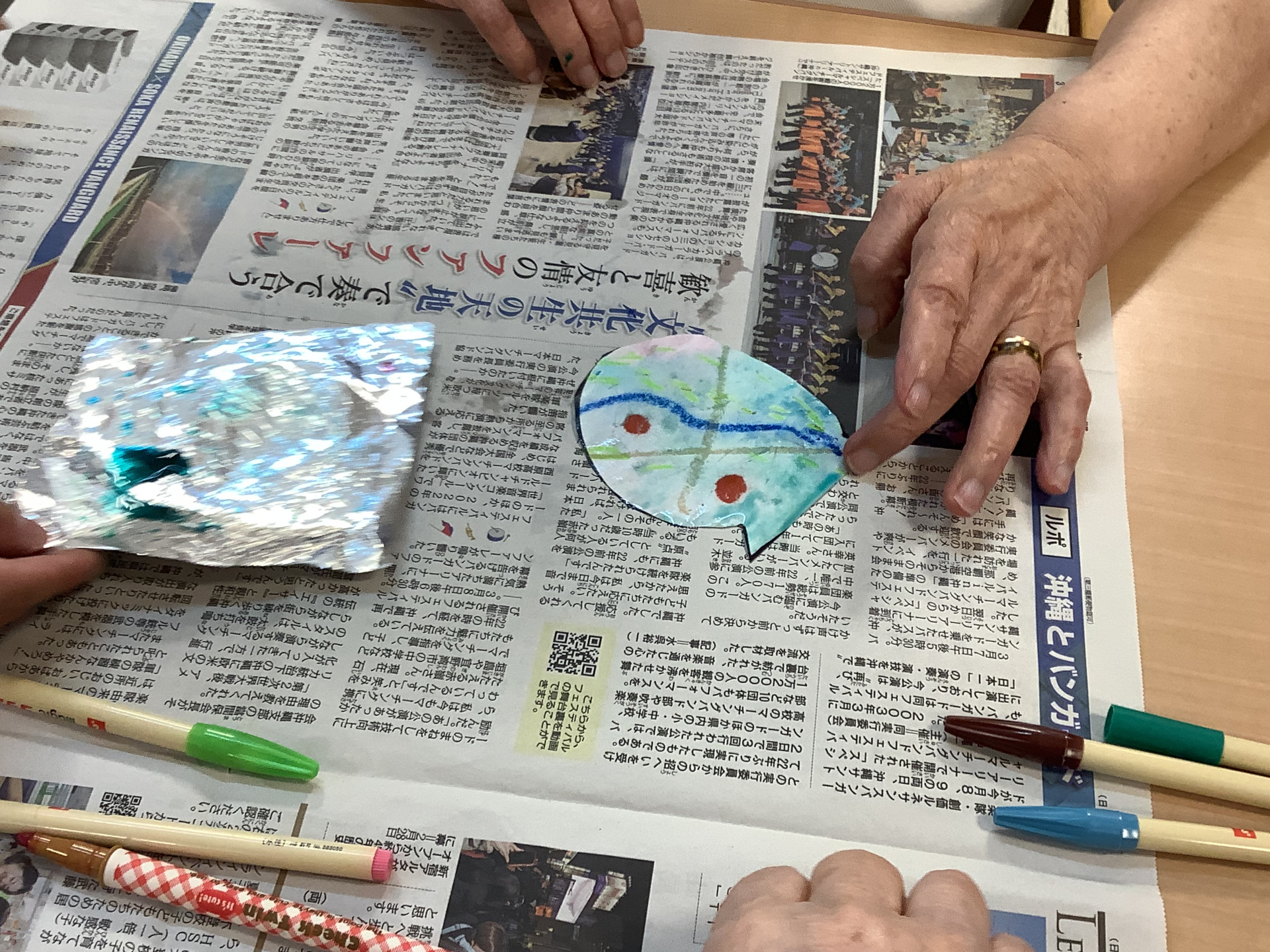 本日の手工芸プログラムは、「季節の壁画制作」と題しまして、壁画作品『ヨーヨー』に挑戦していただきました(^○^)