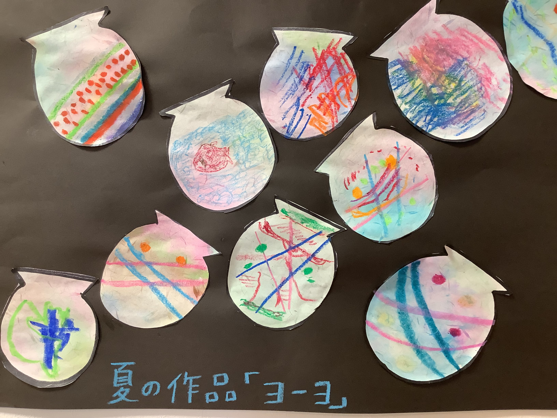 ヨーヨー自体の色は、アルミ箔にのせた絵具をなじませるようにして、水彩独特の色合いを楽しみました(^O^)/