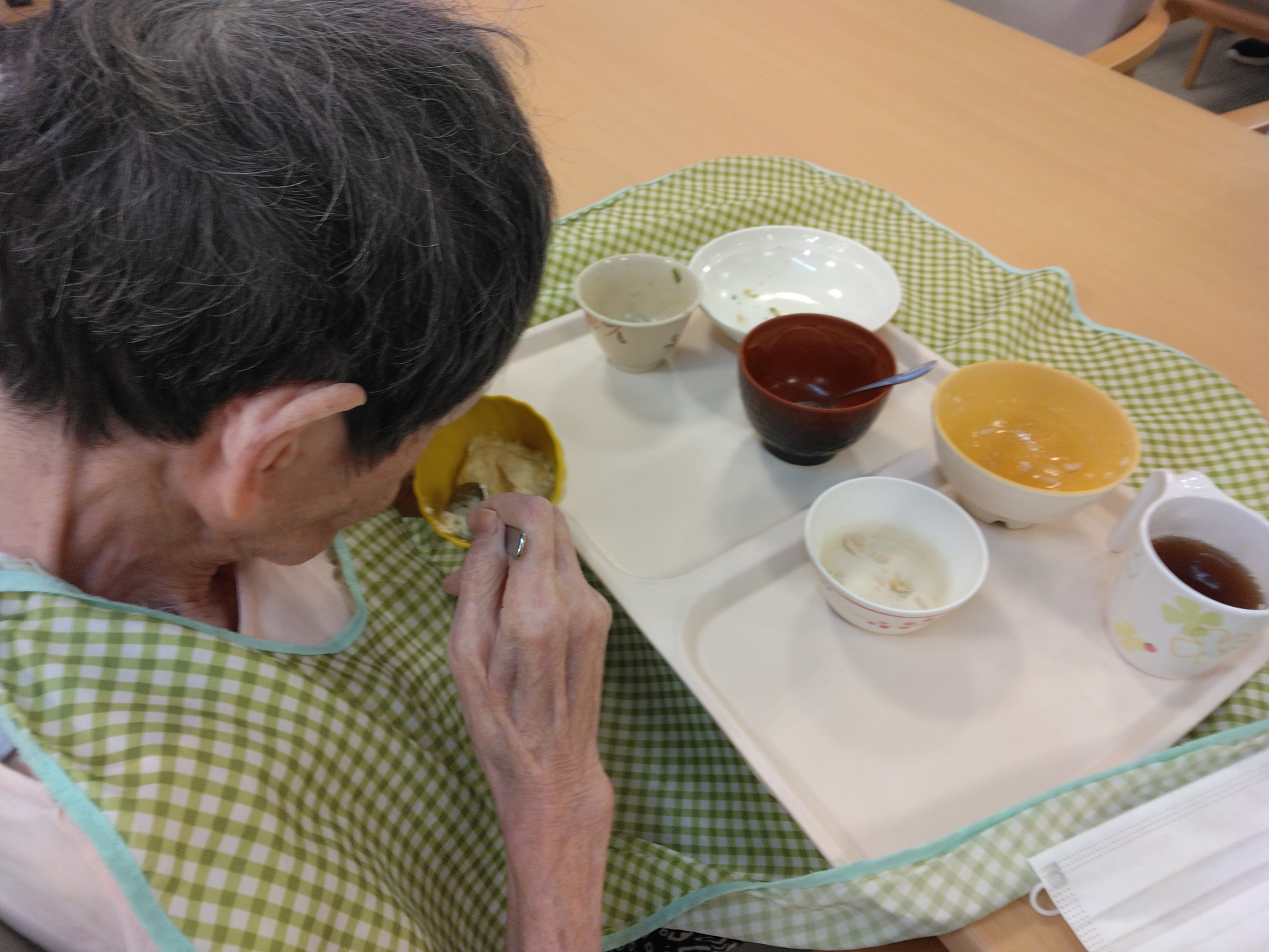 左手に食器を、右手にスプーンをお渡しし、絶えずお声掛けを行うことでゆっくりですが少しずつ、お食事を食べていただいております!
