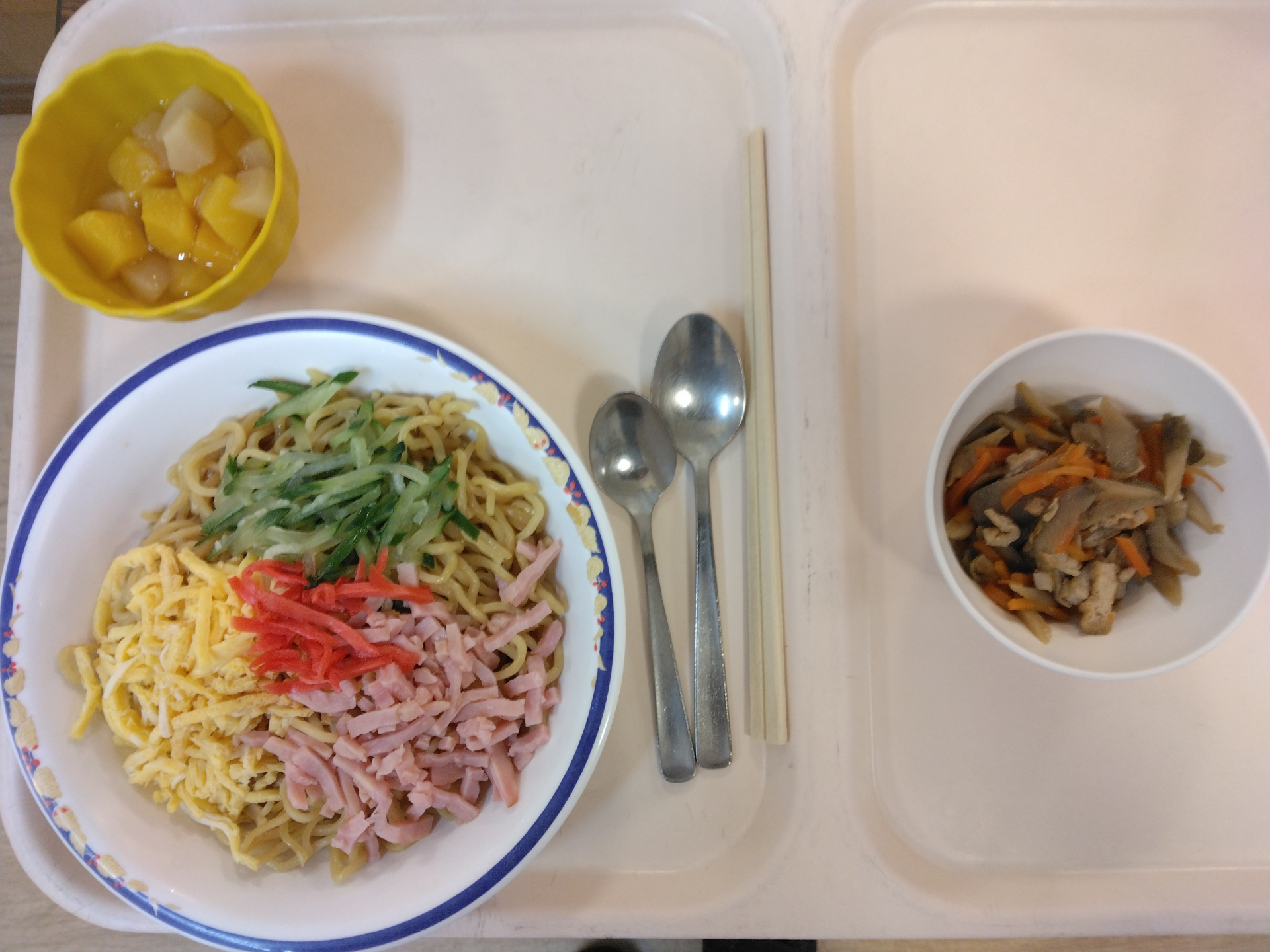 冷し中華に、ごぼうと油揚げの炒め煮、フルーツ(黄桃缶・白桃缶)といったラインナップでした~♪