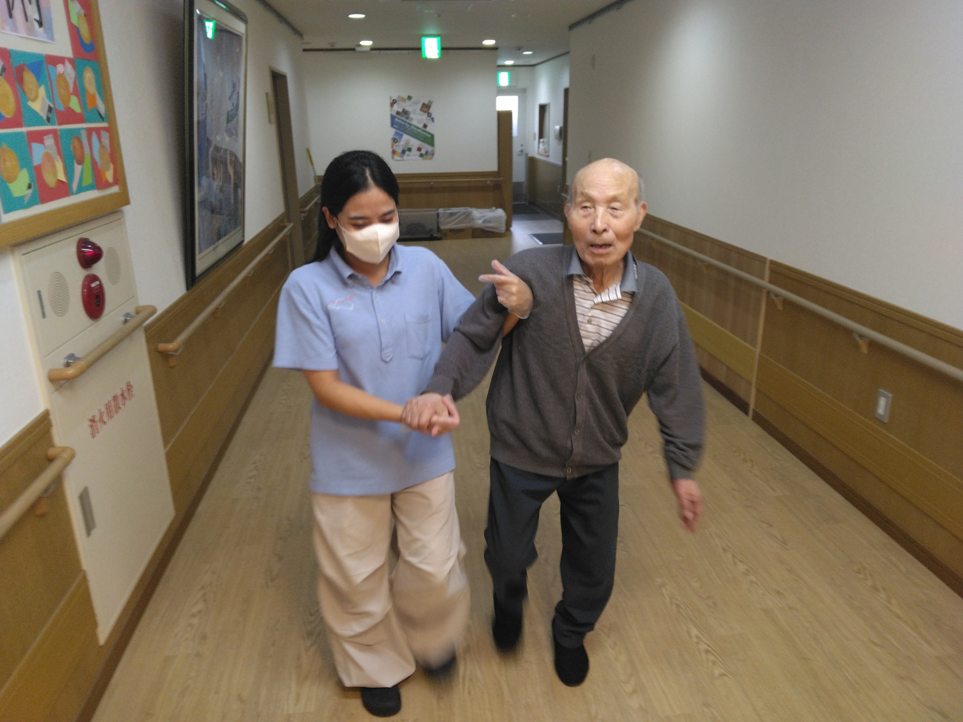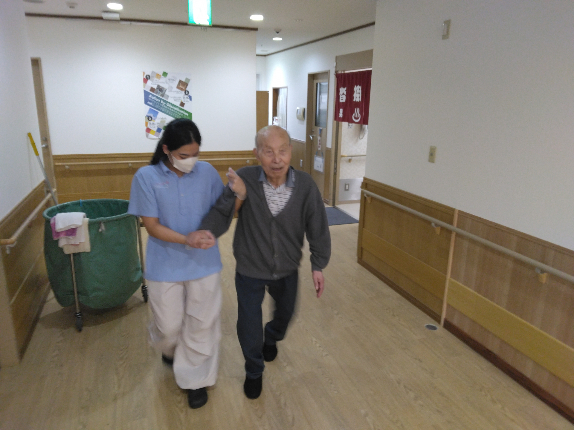 一往復したところで「疲れた!」と仰っておりましたが、付き添いの職員の励ましで頑張ってもう一往復歩いていただきました!
